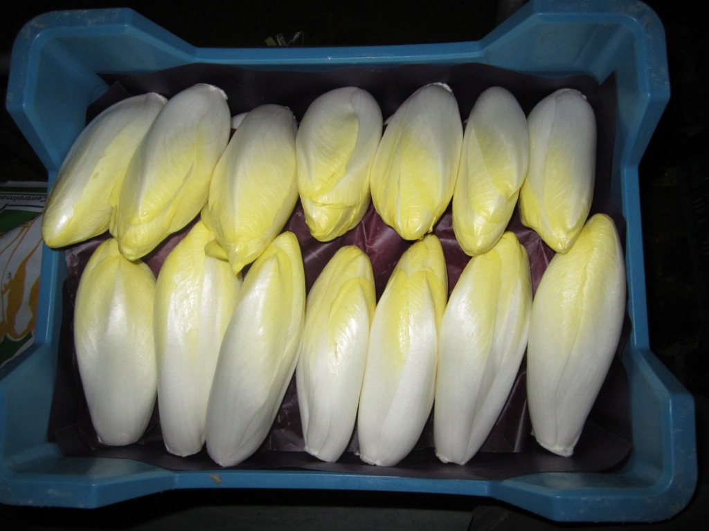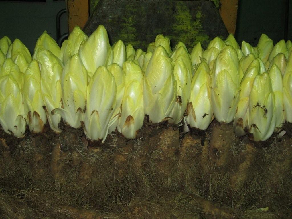 Der Weg zum rund 20 Zentimeter langen spitz zulaufenden Chicorée-Kopf geht über zwei Phasen: Die Anbauer ziehen zunächst die Wurzeln auf dem Acker, bevor daraus in der Treiberei Strunk und Blätter wachsen. Ab zehn bis 14 Grad Bodentemperatur, also überwiegend im Mai, beginnt die Aussaat der Samen auf idealerweise tiefgründigen, gut mit Wasser und Nährstoffen versorgten Böden. Rund 15 bis 25 Pflanzen pro Quadratmeter wachsen in Reihen. Sie ähneln Zuckerrüben und werden mit Spezialmaschinen von Ende September bis November geerntet. Dabei wird das Laub von den Wurzeln getrennt. Hochwertige Wurzeln benötigen eine genau bemessene Stickstoffgabe, aber auch Spurennährstoffe wie Bor, Mangan, Kupfer und Molybdän. Sie sollten bei der Ernte einen Durchmesser von drei bis sechs Zentimetern haben. Die geernteten Wurzeln kommen in die Treiberei, wo sie in spezielle Kisten gesetzt werden. Im Dunkeln bilden sich die leckeren Sprosse.