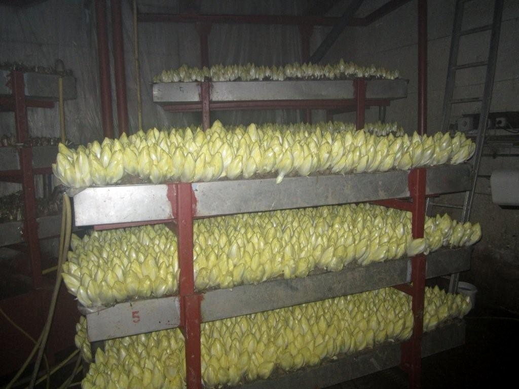 Die geernteten Wurzeln werden zunächst gereinigt und sortiert. Dann werden sie bei Temperaturen knapp unter Null Grad Celsius je nach dem geplanten Liefertermin zunächst gelagert oder direkt in die Treiberei gebracht. Dort legen Mitarbeiter sie aufrecht in wasserdichte Kisten und befördern diese umgehend in einen absolut dunklen, rund zwölf bis 18 Grad Celsius kühlen Treibraum. Eine Nährstofflösung versorgt die austreibenden Wurzeln mit Wasser und Nährstoffen. Nach drei Wochen ist der Chicorée erntereif. Der Spross wird von Hand oder maschinell abgetrennt, gesäubert und verpackt. Weil die Wurzeln mehrere Monate lagerfähig sind, gibt es den frischen Vitaminspender nahezu das ganze Jahr über zu kaufen.