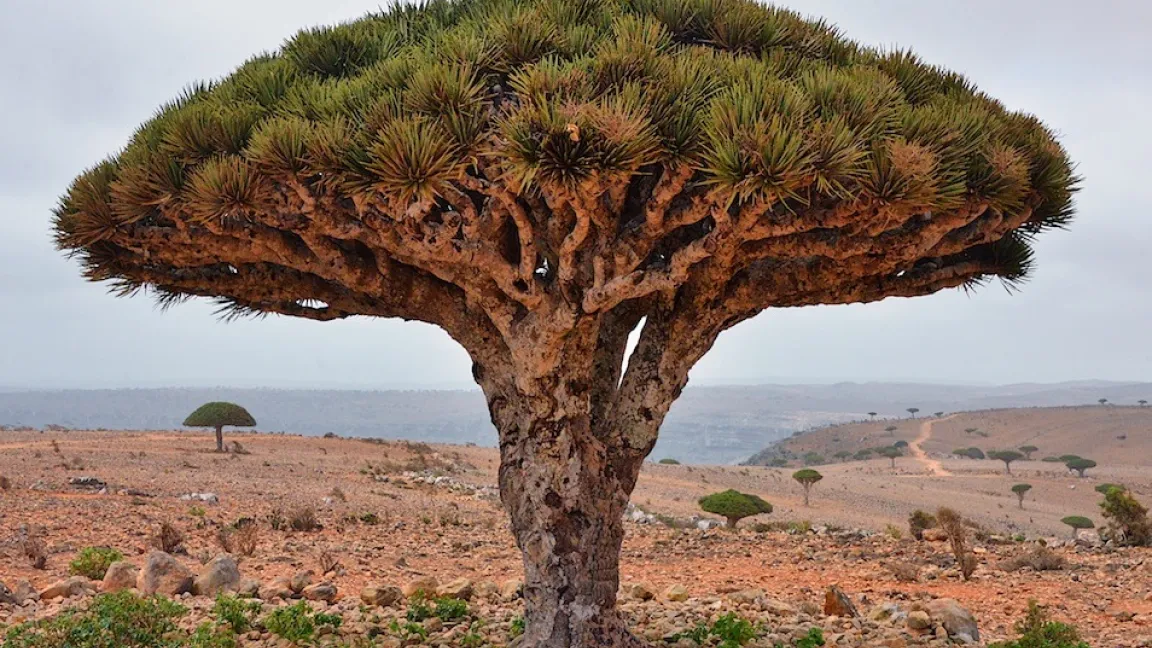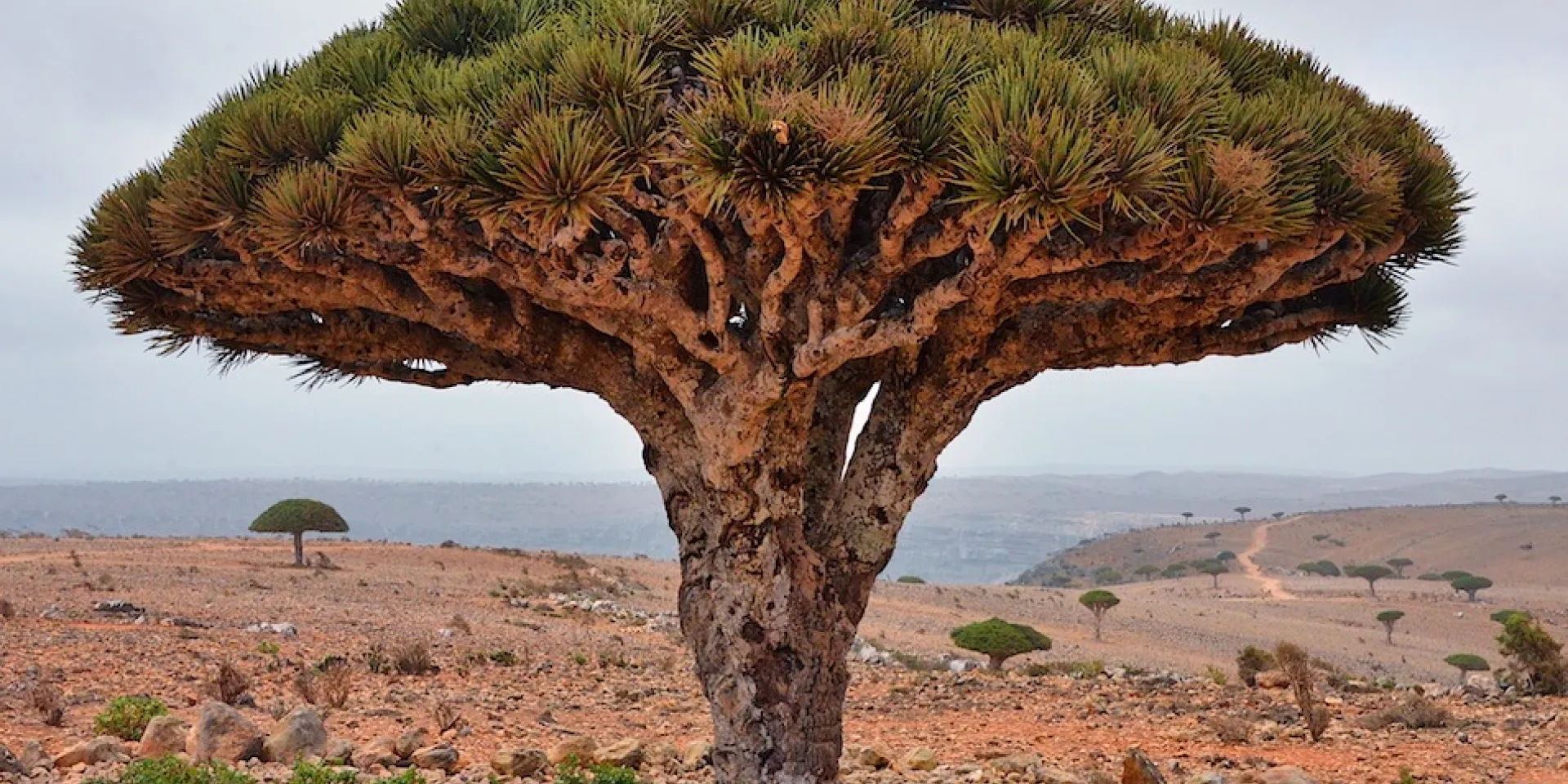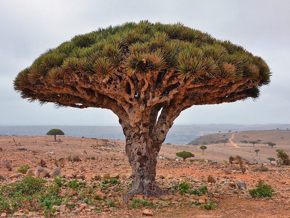 Auf der Insel Sokotra und benachbarten Inseln der gleichnamigen Inselgruppe vor der Küste Ostafrikas und Jemen wächst ein ganz besonderer Baum: der Drachenbaum oder Drachenblutbaum Dracaena cinnabari. Sein Name rührt von dem blutroten Harz, das seit der Antike für die Herstellung von Weihrauch genutzt wird. Der Drachenblutbaum ist heute ein Symbol von Sokotra.Der Drachenblutbaum auf der Inselgruppe Sokotra vor der Küste Ostafrikas und dem Jemen ist eine sogenannte endemische Pflanze. Das bedeutet, er kommt nur an diesem Ort vor. Das Aussehen des Drachenblutbaums kann man mit einem Pilz vergleichen: Er hat eine große, schirmförmige Krone und seine verzweigten Äste sehen Korallen ähnlich. So hat sich der Drachenblutbaum bestmöglich an die trockene Umgebung angepasst. Die Krone fängt Feuchtigkeit auf und spendet dem Untergrund Schatten, sodass dessen Verdunstung vermindert wird. Manchmal sieht man auch mehrere Bäume, die wie unter einem großen Dach zusammengewachsen sind.