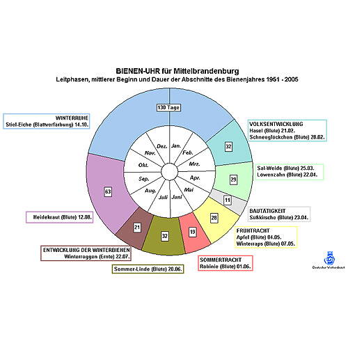 Für Insekten, egal ob Nützling oder Schadinsekt, ist von allergrößter Bedeutung, dass ihre eigene Entwicklung und die ihrer Wirtspflanzen zeitlich zusammentreffen. So ist die Larve des Eichenwicklers beim Schlupf auf das zarte Grün der aufschwellenden Eichenknospen angewiesen. Sind die Knospen noch verschlossen, müssen die Larven verhungern. Treffen Larvenschlupf und das Anschwellen der Knospen aufeinander, können sich die Larven optimal entwickeln. Das war zum Beispiel 2005 der Fall: Damals wurden viele Laubwälder vom Eichenwickler und vom Frostspanner völlig kahl gefressen. Für die Imker hat der Deutsche Wetterdienst anhand der phänologischen Daten eine Bienen-Uhr konstruiert. Sie zeigt, wann in den verschiedenen Gebieten die Blütezeit der wichtigsten Trachten zu erwarten ist. Anhand der Bienenuhr und aktueller Wetterdaten kann der Imker entscheiden, welche Arbeiten er am Bienenvolk durchführt.