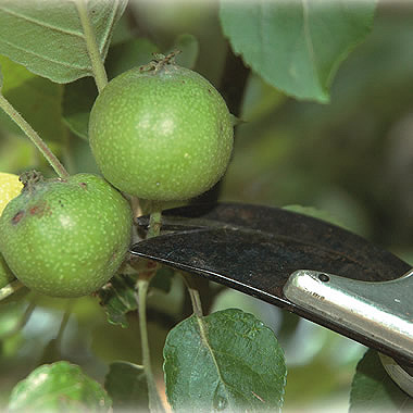 Das Ausdünnen ist eine Kunst für sich: Manchmal lässt man nur einen Apfel pro Trieb hängen, manchmal zwei, drei oder vier. Wichtig ist, dass die Früchte unverletzt und gut genährt sind, denn dann werden sie sich weiterhin prächtig entwickeln.