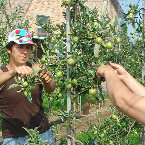 „Habt ihr mich wiedererkannt? Ich bin ein paar Pfunde losgeworden. Seht ihr die kleinen Äpfel auf dem Boden, die ich jetzt nicht mehr tragen muss?Ausdünnen nennt man das. Jeweils zwei Pflücker nehmen sich einen von uns Apfelbäumen vor und zwicken die überflüssigen Äpfel ab. Das ist wichtig, damit sich meine übrigen Früchte optimal entwickeln können. Etwa 80 bis 100 Äpfel sind für meine Größe ideal.