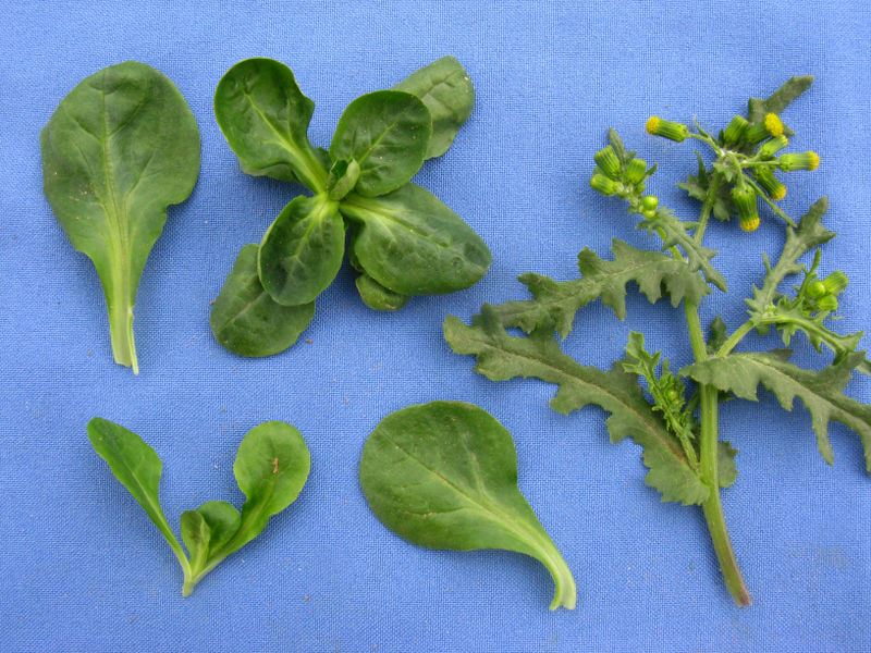 Seit einigen Jahren macht ein sogenannter „Roter Feldsalat“ von sich reden. Die Bezeichnung ist aber irreführend. Tatsächlich ist es ein ähnlich aussehender rotblättriger Romanasalat. Als Unkraut im Freilandanbau kann die Giftpflanze Gemeines Kreuzkraut oder Greiskraut (Senecio vulgaris) auftreten. Anbauer und Verbraucher sollten darauf achten, dass hier keine Verwechslungen und Vermischungen stattfinden.