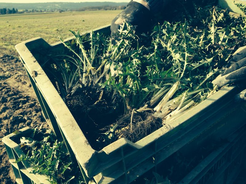 Der Landwirt sät den Löwenzahn im Frühjahr in ein gut vorbereitetes Saatbeet. Das ist eine Sache für den Profi; nur 3 Kilogramm Saatgut werden für einen Hektar, also 10 000 Quadratmeter, gebraucht. 1000 Samen wiegen nicht mal 1 Gramm, die kleinen Flieger sollen in der Natur ja schließlich weit fliegen. Maximal 5 Zentimeter beträgt der Abstand in der Reihe, 50 Zentimeter liegen zwischen den Reihen. Löwenzahn ist ein Dunkelkeimer, der Samen muss also mit Erde bedeckt sein. Die Kultursorten heißen beispielsweise Verbesserter Vollherziger, Nouvelle oder Riesentreib. Über den Sommer wird der Löwenzahn regelmäßig gepflegt, die Wurzeln gelockert, damit sie möglichst dick und kräftig werden, und mit Erde angehäufelt, damit die neuen Triebe möglichst lange unter der Erde treiben. Im Herbst wird der Löwenzahn gerodet und die buschigen Horste ins Kühllager gebracht.