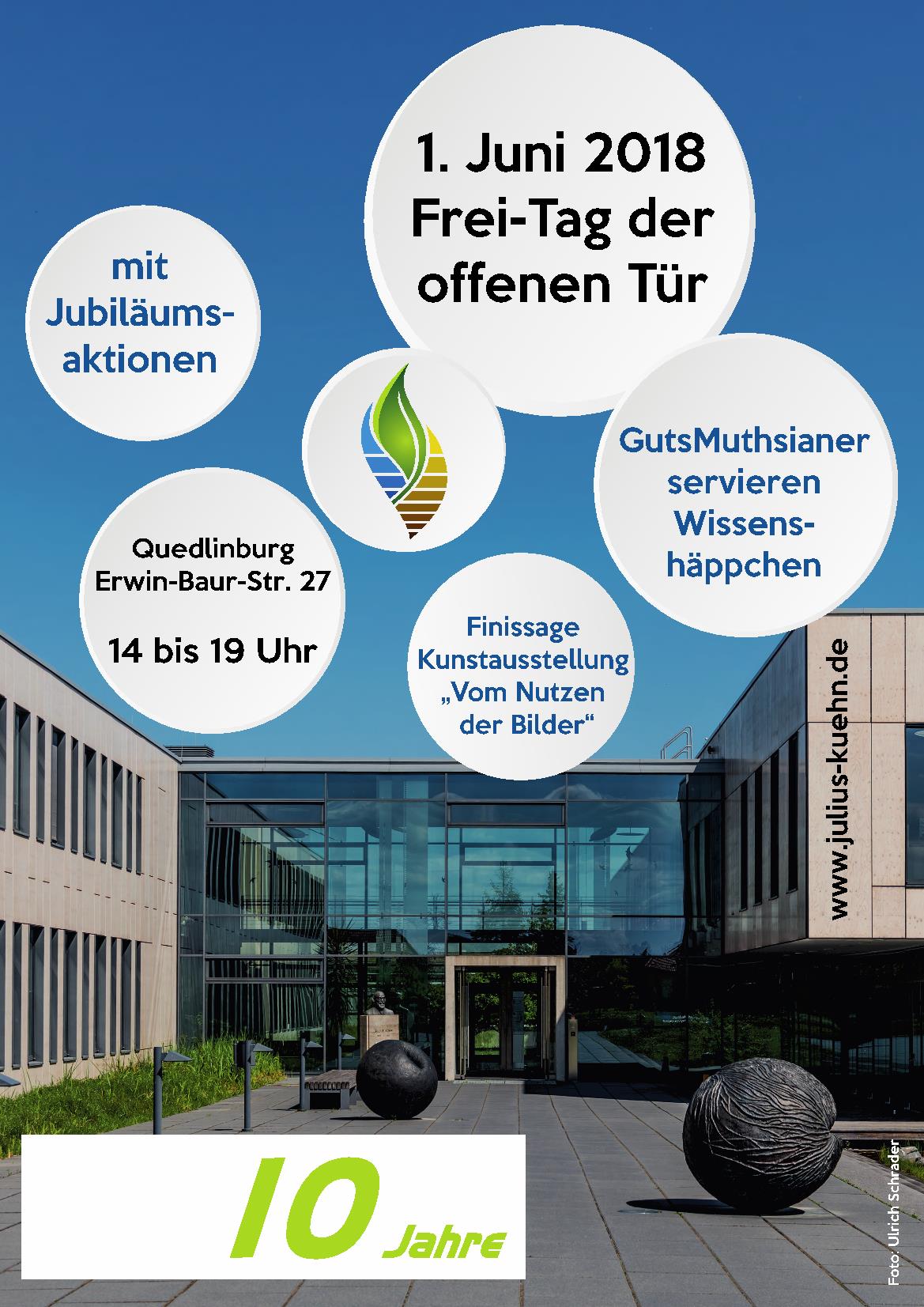 Das Bundesforschungsinstitut für Kulturpflanzen, das Julius Kühn-Institut (JKI), feiert in diesem Jahr sein 10-jähriges Bestehen. Dieser runde Geburtstag wird mit mehreren Aktionen und Feierlichkeiten begangen, unter anderem mit einem Tag der offenen Tür am 1. Juni am Hauptsitz in Quedlinburg.An diesem Tag erwartet die Besucher ein unterhaltsamer Einblick, wie vielfältig die Forschung am JKI ist. Damit will das Institut nach den Worten von Präsident Dr. Georg Friedrich Backhaus aber „nicht nur ehrwürdige Traditionen beleuchten, sondern jungen Menschen, die vielleicht unsere Pflanzenforscher von morgen werden, eine Plattform bieten.“ Und so wurden Schüler des Quedlinburger Patengymnasiums zeitweise zu Wissenschaftlern: Unter dem Motto „10 Jahre − 10 Themen“ haben sie seit Sommer 2017 in verschiedene Forschungsgebiete hineingeschnuppert. Beim Tag der offenen Tür werden sie ihre Erkenntnisse an zehn Ständen als „Wissenshäppchen“ präsentieren. An diesen zehn Ständen zeigt sich die ganze Bandbreite der JKI-Forschung – ob Duftstoffquiz, leuchtende Arabidopsis-Pflanzen oder Resistenzforschung.