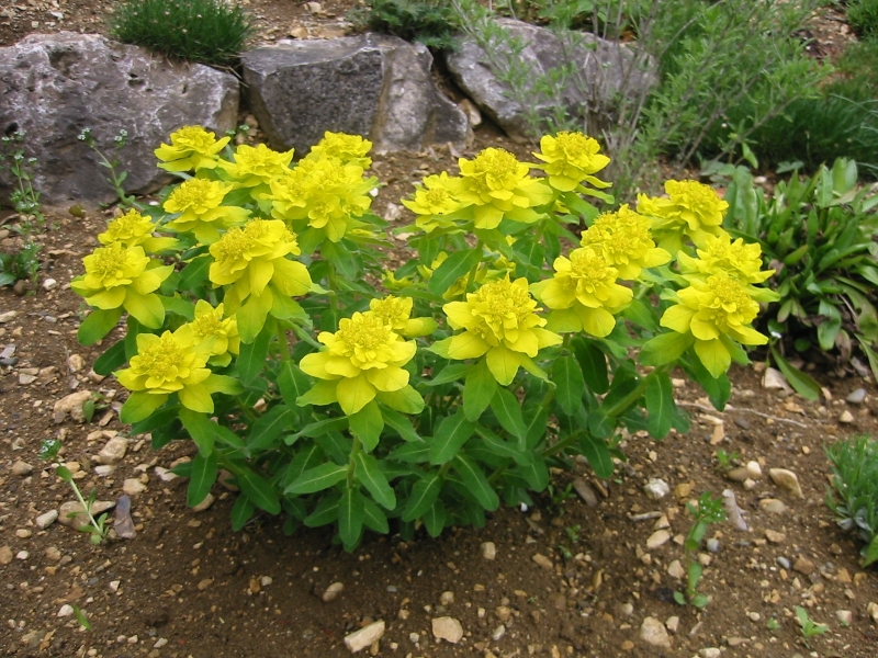 ist dagegen die mehrjährige Gold-Wolfsmilch (Euphorbia polychroma). Die Staude wächst horstartig, halbkugelig buschig und wird bis zu 35 Zentimeter hoch. Sie kann ab Mai für leuchtend gelbe Farbtupfer sorgen, vor allem an sonnigen Böschungen und Terrassen, auf Rabatten und an offenen, warmen Gehölzrändern. Dabei sind es nicht Blüten, die für das kräftige Gelb verantwortlich sind, sondern es ist ein Kranz von Hochblättern. Dem Hobbygärtner kommt es übrigens entgegen, dass diese Wolfsmilch auch zeitweilig austrocknende Böden in sonniger Lage nicht übel nimmt.