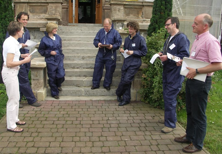 "Auf Wiedersehen Bilderbuch-Romantik, willkommen Landwirtschaft heute." Im Jahr 2010 werden wieder Lehrerinnen und Lehrer die Landwirtschaft erkunden und verschiedene Betriebe besuchen. Die Exkursionen des Industrieverbands Agrar (IVA) und der Fördergemeinschaft Nachhaltige Landwirtschaft (FNL) richten sich an Fachleiter und ihre Referendare. Die Lehrenden lernen dabei moderne Methoden der Exkursionsdidaktik am Beispiel Landwirtschaft - Stallgeruch inklusive.Ruthe bei Sarstedt im Juli 2009. Maik Böing, selbst Fachleiter für Erdkunde am Studienseminar Vettweiß, verteilt einen Packen Overalls. Die Fachleiterinnen und Fachleiter für Erdkunde und Biologie ziehen sich die Blaumänner in Einheitsgröße an und streifen anschließend noch Kunststoffüberzieher über ihre Schuhe. Die Gruppe will aber kein Kernkraftwerk besuchen, sondern einen Bauernhof: das Lehr- und Forschungsgut Ruthe der Tierärztlichen Hochschule Hannover. Böing erklärt den Sinn der Verkleidung: Die Teilnehmer sollen keine Krankheiten in die wertvollen Tierbestände einschleppen, damit sie weder die Gesundheit der Tiere gefährden noch die laufenden Versuche beeinträchtigen.