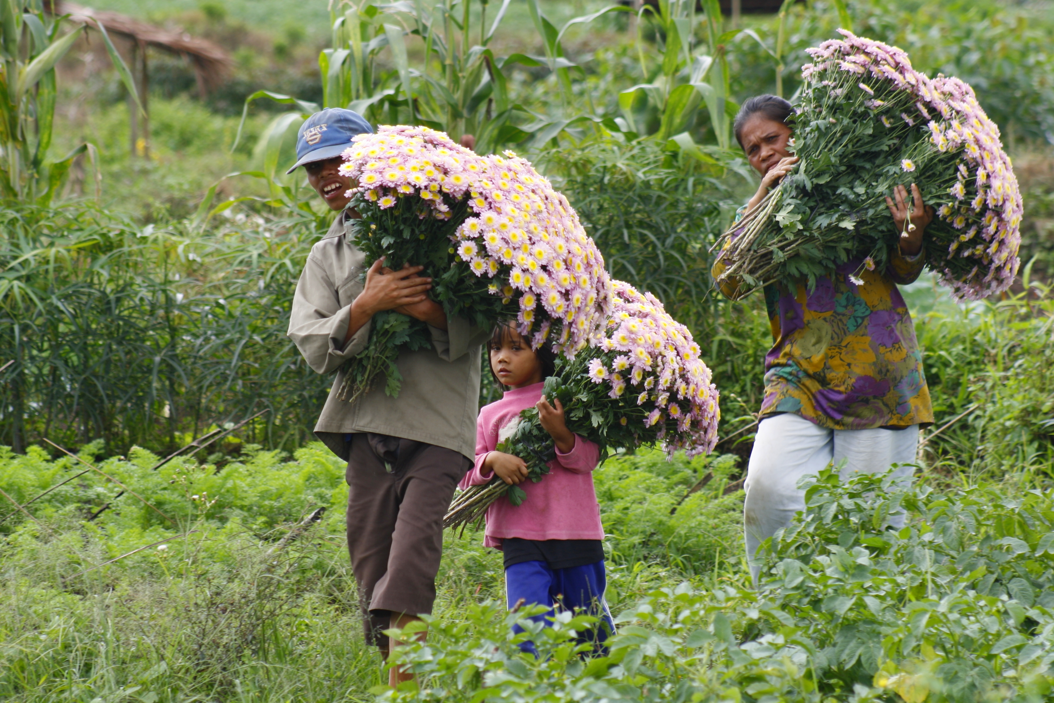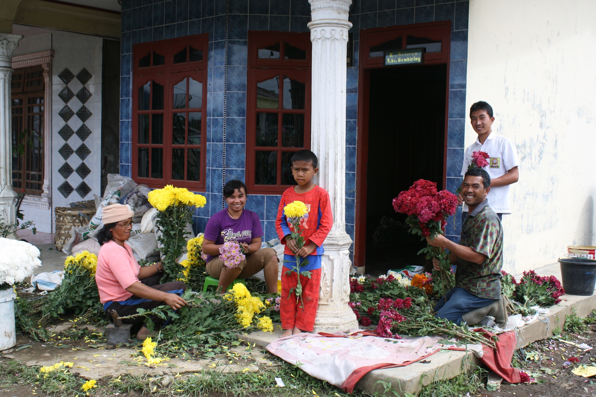 Drei bis fünf Monate brauchen die Blumen von der Pflanzung bis zur Ernte. Zu großen Sträußen gebunden bringt Karya sie auf den Markt nach Jambur. “Manchmal kann ich sie für 12.500 Indonesische Rupien (etwa 1,15 US-Dollar) verkaufen und manchmal bekomme ich 15.000”, erzählt seine Frau Intiati. „Alles hängt von den Käufern ab“. Das Einkommen aus der Blumenernte würde zwar niemals ausreichen, um die Familie zu ernähren, aber es sorgt für ein paar Extras im Leben – für Schulsachen oder andere kleinere Lebenshaltungskosten. „Manchmal erwirtschaften wir bei einer Ernte mit den Blumen 500.000 Indonesische Rupien (etwa 45 US-Dollar), ein anderes Mal nur 300.000 (etwa 30 US-Dollar).“