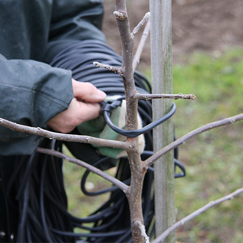 Schmitz Hübsch pflanzt Edelsorten, die auf schwachwüchsigen Wurzelstöcken – der so genannten Unterlage - aufgesetzt sind. Diese Unterlage, bei Äpfeln ist es meistens M9, wächst nur langsam. Statt viel Kraft für das Wachstum eines hohen, dicken Stamms zu verwenden, tragen die aufgesetzten Edeltriebe schon früh eine reiche Ernte. Manchmal wird zwischen der Unterlage und der Früchte tragenden Baumkrone noch eine dritte Sorte eingepasst. „Bei den Apfelsorten Cox Orange, Topas und Berlepsch ist es empfehlenswert, ein Zwischenstück für die Stammbildung einzusetzen“ erklärt Roland Schmitz Hübsch „Oft nimmt man dafür ein Stück der Sorte Golden Delicious.“ Das ist sinnvoll, weil bestimmte Sorten sehr anfällig für die Kragenfäule sind. Diese Krankheit wird von Phytophtora cactorum verursacht, einem weit verbreiteten Schadpilz im Boden. Er wird den Oomyceten zugeordnet und befällt die Rinde. Sie platzt auf, und die darunter liegenden Leitungsbahnen des Baums werden zerstört. Im schlimmsten Falle stirbt der Baum ab. Die Sorte Golden Delicious ist vergleichsweise unempfindlich, weil sie einen sehr glatten Stamm mit einer wenig anfälligen Rinde bildet.