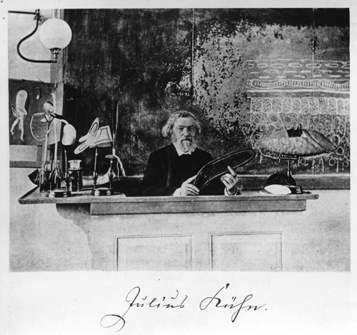 … – so wurde der junge Julius Kühn scherzhaft von seinen Zeitgenossen genannt. Schon in seinen Jahren als Verwalter eines Gutes in Schlesien (1848 – 1855) hat sich der aus einfachen Verhältnissen stammende Kühn intensiv mit Pflanzenschutz beschäftigt. Dabei war ein Mikroskop sein ständiger Begleiter. Zu dieser Zeit verursachte die Rapsschwärze große Schäden. Mit dem Mikroskop gelang es Kühn, die Entwicklung der Krankheit zu verfolgen, den verursachenden Pilz zu bestimmen und Gegenmaßnahmen abzuleiten. Er war so begeistert von diesem Hilfsmittel, dass er es als unverzichtbares „Hausgeräth des Landwirthes“ bezeichnete. Nach einigen Jahren in der Praxis startete Kühn seine akademische Karriere. 1855 studierte er an der landwirtschaftlichen Akademie in Bonn-Poppelsdorf und machte im Anschluss seinen Doktor. Bereits 1858 veröffentlichte er das Buch „Die Krankheiten der Kulturgewächse, ihre Ursachen und ihre Verhütung“. Es gilt weltweit als das erste spezielle Lehrbuch über Pflanzenkrankheiten.