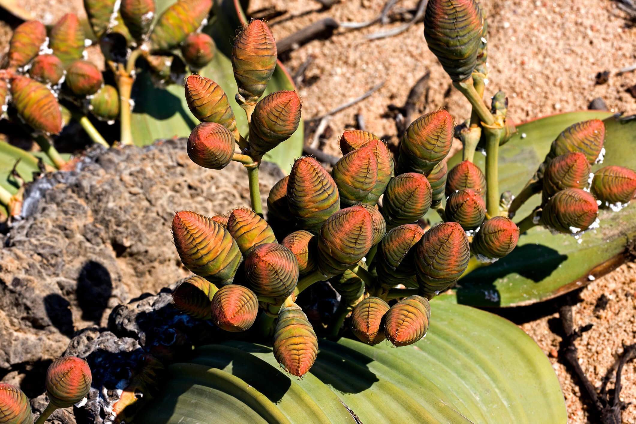 Welche Pflanze gibt es männlich und weiblich, ist 1500 Jahre alt und kommt in der Wüste Namib in der Nähe von Swakobmund vor? Würde eine Frage in einem Quiz so lauten, wüssten wohl nur die wenigsten Menschen die Antwort. Es ist die Welwitschie. Die Wüstenpflanze kommt unter anderem im Wappen Namibias vor, dessen Nationalpflanze sie ist. Sie ist äußert angepasst an die widrigen Lebensumstände, wie sie in der Wüste herrschen.Hoch spezialisiert, so könnte man die Anpassung der Welwitschie (Welwitschia mirabilis) an die harten Bedingungen der in Namibia und Süd-Angola liegenden Namib-Wüste am besten beschreiben. Entdeckt hat die Pflanze der österreichische Arzt und Botaniker Friedrich Welwitsch 1859 auf einer Reise durch Angola. Von ihm hat sie daher auch ihren deutschen Namen bekommen. Bei den Einheimischen wurde sie Tumboa oder n'tumbo genannt, was „Stumpf“ bedeutet. Das Hirtenvolk der Herero nennt sie übersetzt übrigens „Wüstenzwiebel“, da früher die Menschen ihr Mark roh oder gebraten gegessen haben. Zu ihren tierischen Liebhabern gehören Oryx-Antilopen, Nashörner oder Zebras, auch sie haben die Pflanze zum Fressen gern.