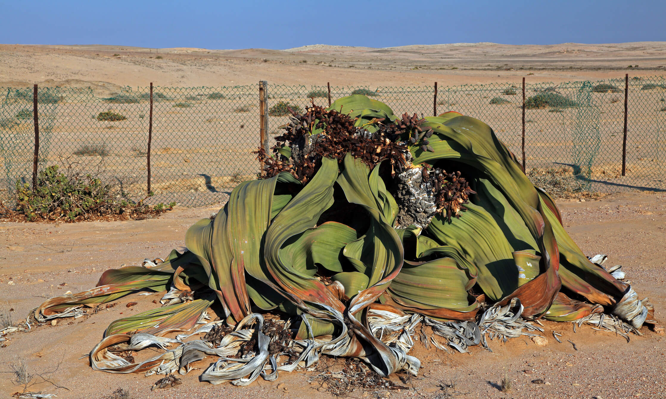 Das Besondere an der Welwitschie ist: Sie besitzt nur ein einziges Blattpaar. Wie kann die Pflanze so mehrere hundert Jahre alt werden, fragt man sich. „Zwei-Blatt-kann-nicht-sterben“ lautet daher auch ihr Name auf Afrikaans. Nach herkömmlichem Maßstab ist die Welwitschie nicht gerade schön, oft sieht sie eher aus, wie wenn die Blätter gerade alle vertrocknet oder verfault sind, doch das „lebende Fossil“ hat durchaus etwas Faszinierendes, ja geradezu Wunderbares, wie der Nachsatz mirabilis verrät. Die Welwitschie ist getrenntgeschlechtlich, es gibt sie also als weibliche und als männliche Pflanzen. Sie hat oberirdisch einen rübenähnlichen verholzten Stamm, der zwischen 50 Zentimeter und 1,50 Meter hoch wird. Die Pfahlwurzel reicht bis in tiefe Bodenschichten. Das älteste bekannte Exemplar, die „Riesen-Welwitschie“ nahe der namibischen Stadt Swakopmund ist 1500 Jahre alt. Man kann sie auf dem „Welwitschia-Drive“ südöstlich der Stadt bewundern. Die Route führt durch die westliche Namib-Wüste und zeigt viele Welwitschien. Durch einen Zaun wird die menschengroße Riesen-Pflanze vor allzu neugieriger Besichtigung geschützt.