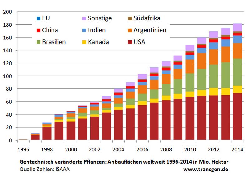 Die Anbauflächen gentechnisch veränderter Pflanzen (GVO) nehmen weiter zu. 2014 ist die Anbaufläche um sechs Millionen Hektar auf 181 Millionen Hektar gestiegen. Das sind drei Prozent mehr als 2013. Das ist das Ergebnis der jährlichen Statistik der Agro-Biotechnologie-Agentur ISAAA.Jährliche ISAAA-Statistik belegt seit Jahren Aufwärtstrend