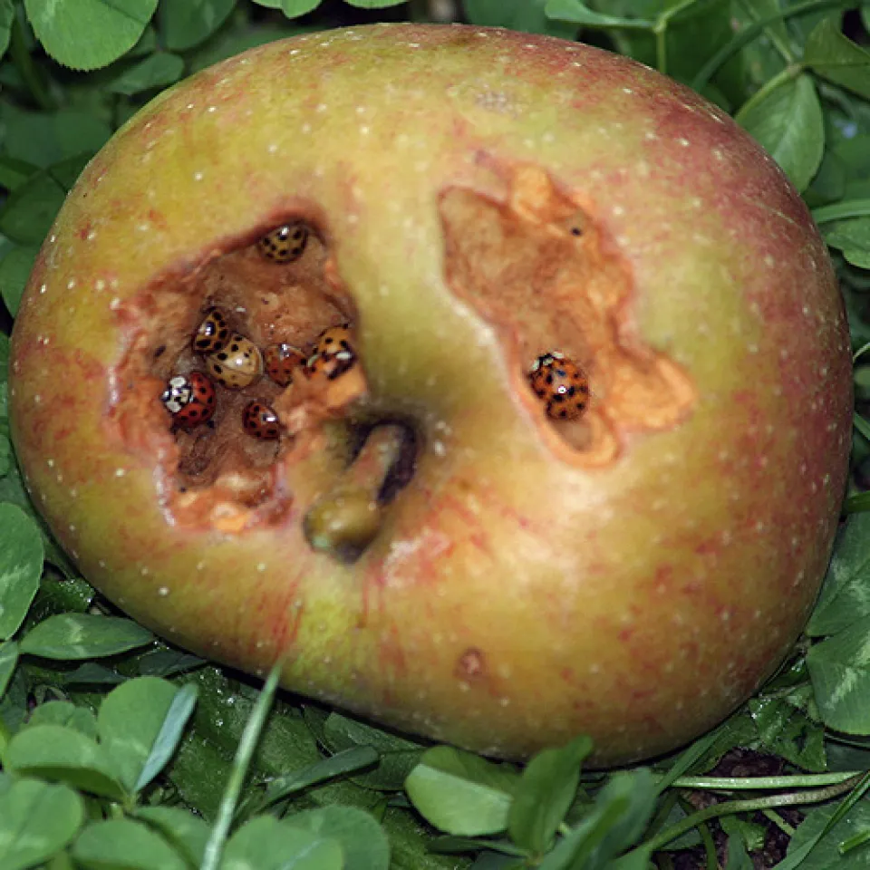 Jetzt werden die ersten Äpfel geerntet. Dabei ist Vorsicht geboten, denn manche Äpfel enthalten eine unliebsame Überraschung. Ursprünglich sollte sich der Asiatische Marienkäfer als unbändiger Läusefresser auch in Europa nützlich machen. Inzwischen hat er sich hier massenhaft vermehrt und ausgebreitet. So ist er zum Konkurrenten oder sogar zum Feind heimischer Marienkäfer geworden. Lästig ist, dass er mit Beginn der kalten Jahreszeit in ganzen Schwärmen auch in Häuser und Wohnungen einfällt. Auch Apfelbäume und ihre Früchte scheinen es ihm angetan zu haben.Die Apfelernte bringt es an den Tag: In manchen großräumig ausgehöhlten Äpfeln halten sich dutzendweise Marienkäfer auf. Die Fraßstellen sehen aus als knabberten sich die Käfer regelrecht in die Früchte hinein. Die ungebetenen Mitesser waren Asiatische Marienkäfer, erkennbar an der typischen einem W oder M ähnelnden Zeichnung auf ihrem Halsschild. Ein Ärgernis waren sie früher schon in einer anderen süßen Umgebung: in Weintrauben. Zur Weinlese 2007 hatten sie sich im Osten und Norden Frankreichs in solchen Massen in den Trauben verkrochen, dass sie nicht komplett entfernt werden konnten. Beim Keltern der Beeren wurde ihre bitter schmeckende Körperflüssigkeit frei, die so genannte Hämolymphe. Die Käfer sondern sie ab, wenn sie von natürlichen Feinden bedroht werden. Der Traubensaft war nicht mehr zu genießen.