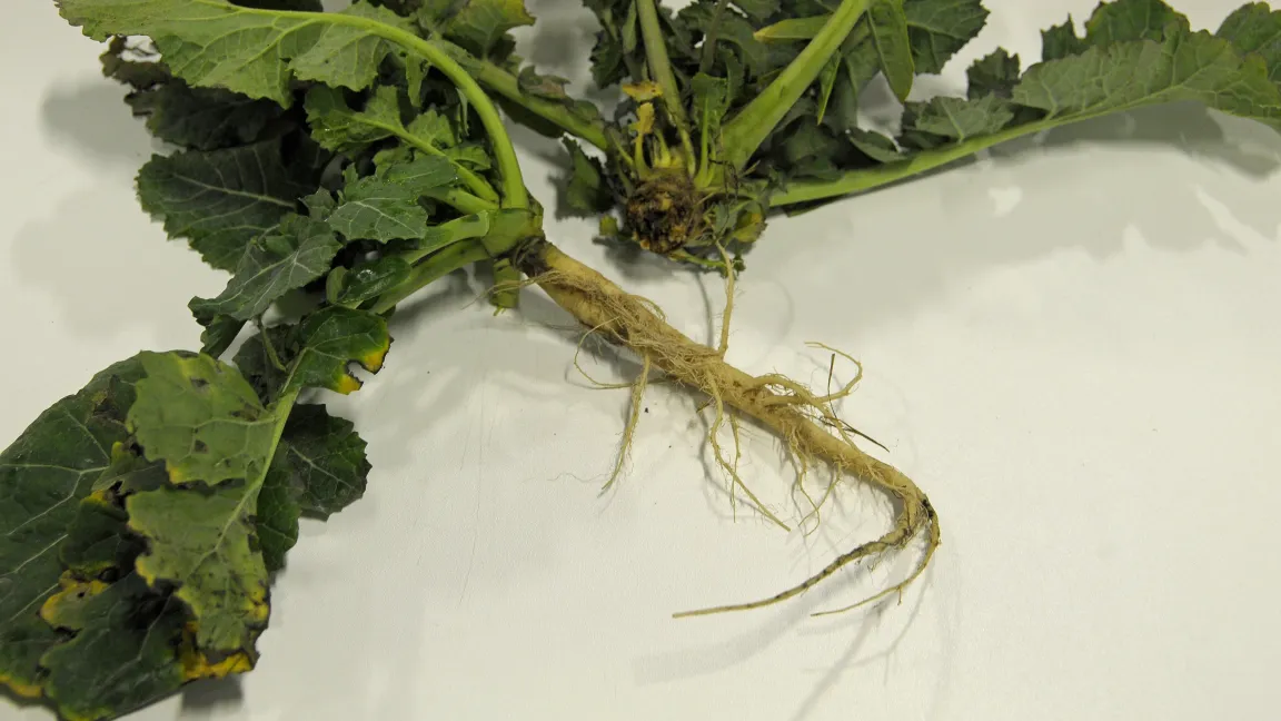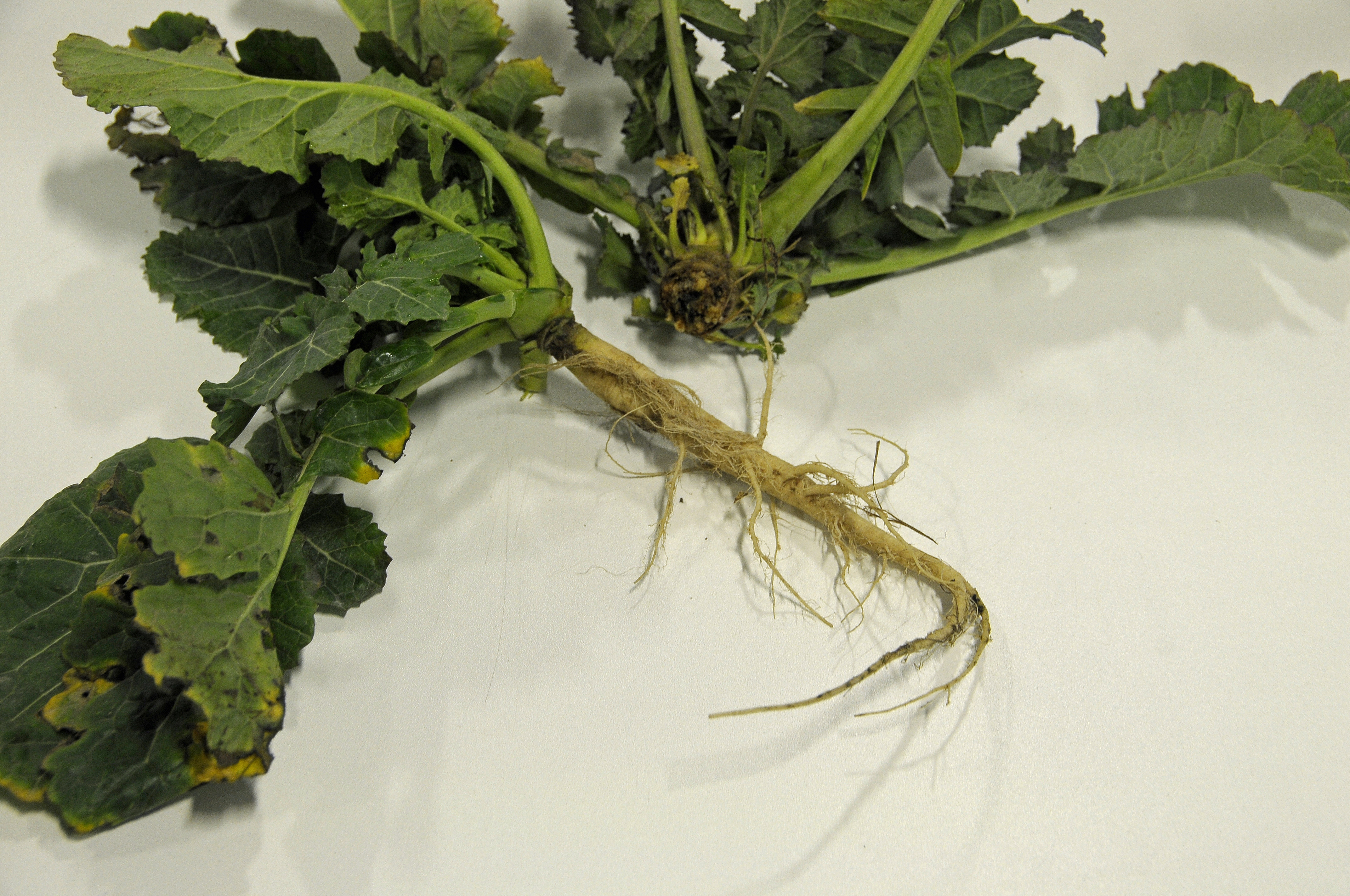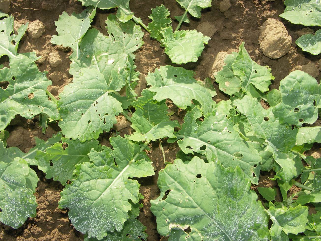 Die Kleine Kohlfliege hat vielfach die für den Raps typische tiefreichende Pfahlwurzel zerstört. Die betroffenen Pflanzen haben jetzt stattdessen einen Wurzelbart oder Nebenwurzeln. Das sind kurze Wurzeln, die kaum in die tiefen Bodenschichten vordringen. Kommt eine Trockenphase, können sie weder Wasser, noch Nährstoffe aus dem Unterboden liefern. Probleme machen auch die Pflanzenverletzungen durch den Rapserdfloh. Diese sind ideale Eintrittspforten für Phoma und andere Krankheiten. Die Pilzkrankheit führt zu Fäulen an Wurzelhals und Stängel. Warme und feuchte Witterung fördern die Ausbreitung.