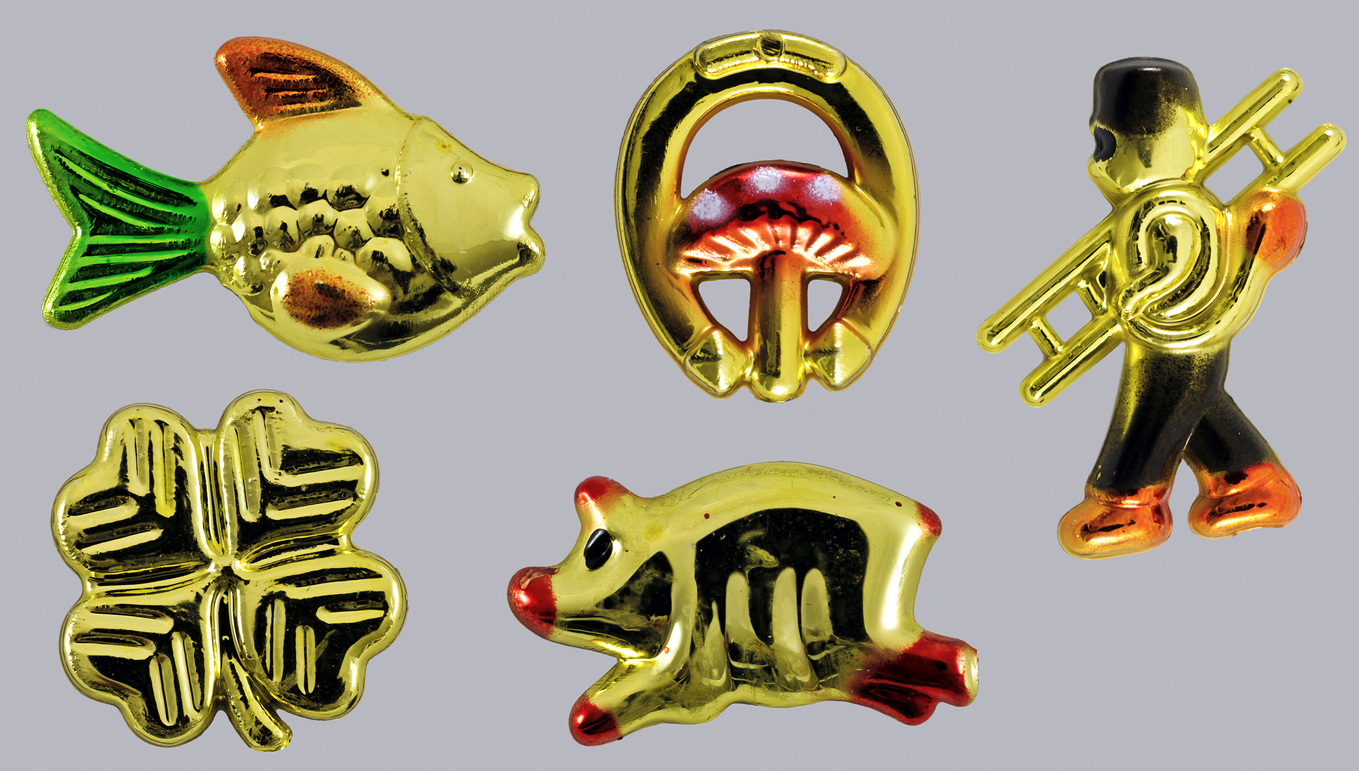 Was haben ein Hufeisen, Glücksschweine aus Marzipan, vierblättrige Kleeblätter und der Schornsteinfeger gemeinsam? Sie gelten alle als Glücksbringer, die man gern an Silvester verschenkt, damit der Beschenkte im neuen Jahr Glück, Gesundheit und Erfolg hat. Wer bei anderen zur Silvesterfeier eingeladen ist, bringt vielleicht einen Glücksbringer mit, gern auch Selbstgemachtes wie etwa herzhafte Hefe-Schweinchen. Auch die beliebten asiatischen Glückskekse lassen sich selbst backen und bringen Unterhaltung in einen Silvesterabend. In manchen Regionen ist das Essen von Linsensuppe verbreitet. Die kleinen Linsen symbolisieren Reichtum im kommenden Jahr, da sie wie Goldmünzen aussehen. Nachdem man dann die letzten Sekunden vor dem Jahreswechsel heruntergezählt hat und mit Sekt auf das neue Jahr angestoßen hat, gibt es mancherorts Neujahrs-Berliner. Gefüllt sind sie im Normalfall mit Konfitüre. Einer davon aber enthält Senf. Derjenige, der den Senf-Berliner erwischt hat, wird mit Glück im kommenden Jahr belohnt. Übrigens, Sekt und besonders Champagner konnte sich früher nicht jeder leisten. Deswegen war der Silvesterpunsch mit Wasser, in betuchteren Haushalten auch Wein, Tee, Zitrone und Zucker bis ins 20 Jahrhundert das Getränk der Wahl zum Jahresausklang.