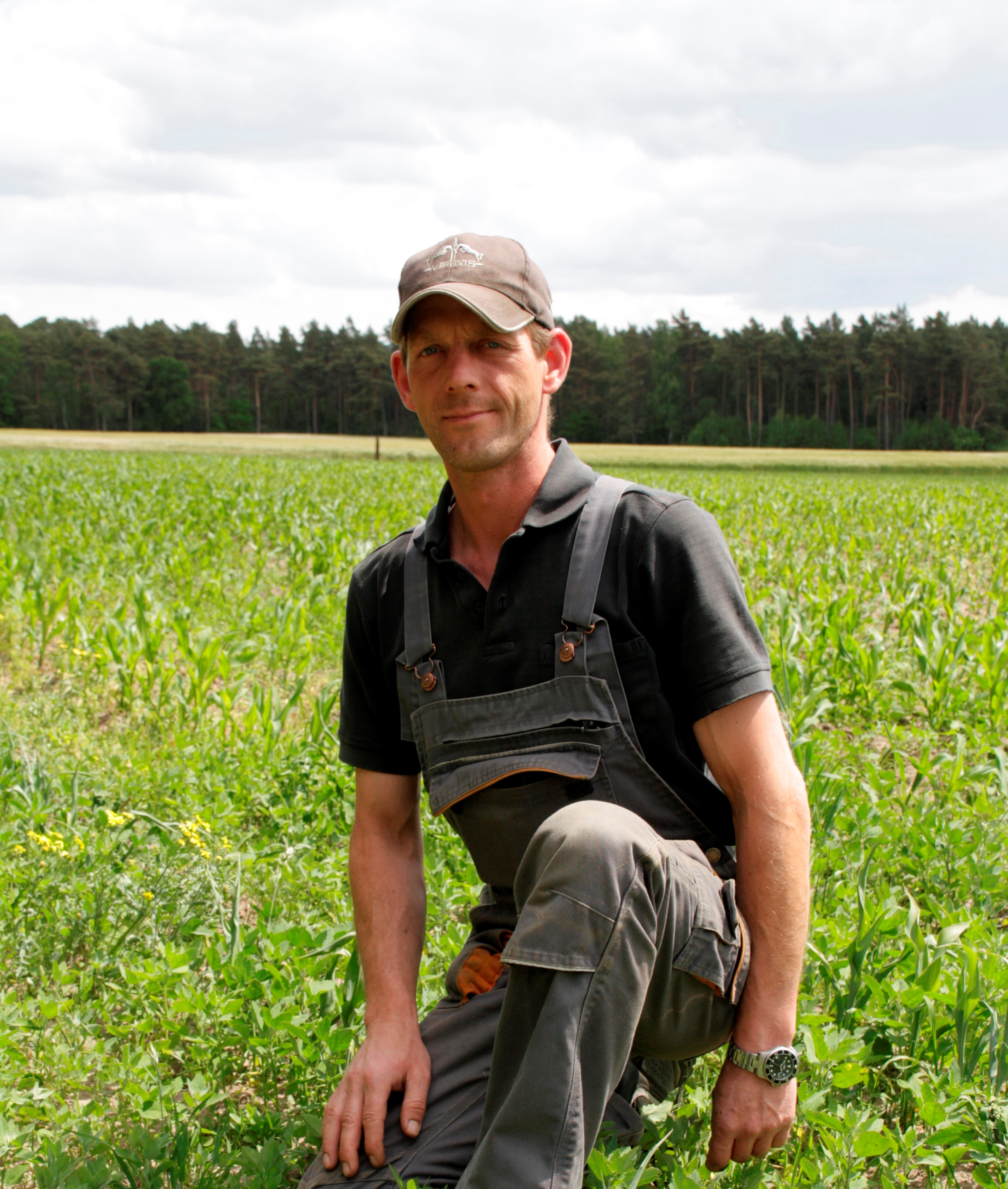 Mein Name ist Nino Meine, ich bin Landwirt im Heidekreis in Niedersachsen. Wir bewirtschaften einen landwirtschaftlichen Betrieb mit 105 Hektar, davon 30 Hektar Grünland und 75 Hektar Ackerland. Diese teilen sich auf in 50 Hektar Gersten- und Weizenvermehrung für einen Getreidezüchter, 10 Hektar Energiemais für die Biogasanlage und 15 Hektar mit der Agrar-Umweltmaßnahme Ackerwildkräuter. Auf dem Grünland stellen wir Pferdefutter zum Verkauf her. Außerdem haben wir noch einen Lohnbetrieb, wir dreschen für andere Landwirte und machen ihre Bodenbearbeitung mit dem Grubber oder der Scheibenegge. Unsere Flächen sind sehr sandig, sie liegen in einem Endmoränengebiet in der Südheide. Deswegen müssen wir intensiv beregnen, damit wir zufriedenstellende Erträge haben.