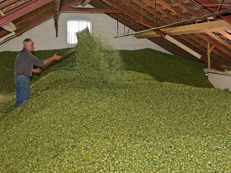 Die Hopfenernte ist dann noch einmal eine sehr hektische Phase. Vier Wochen hat Andreas Dick Zeit, sein "grünes Gold" einzufahren. Dann kommen die Erntehelfer zum Einsatz, und es ist vorbei mit der Einsamkeit. Auf dem Hof wird der Rohhopfen von 80 auf mindestens zwölf Prozent Wassergehalt getrocknet und in 50kg-Säcke abgefüllt. Dann kommt der amtliche Siegelmeister der Bezirksregierung nach Holsthum. Im Gepäck hat er das rote Siegel "Bitburger Siegelhopfen", mit dem er jeden einzelnen Sack kennzeichnet. So wird aus einem schlichten Eifeler Hopfen ein unverwechselbarer Gebietshopfen.
