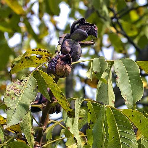Zwei der wichtigsten Krankheitserreger an Walnussbäumen sind ein Bakterium Pseudomonas juglandis und ein Pilz Marssonina juglandis. Beide rufen ähnliche Symptome hervor. Sie können auch in die schwarz-braun verfärbten Nüsse eindringen und die Frucht zerstören. Eine Bekämpfung mit Pflanzenschutzmitteln ist nicht möglich. Um eine Ansteckung im nächsten Frühjahr zu verhindern, müssen fleckiges Laub und kranke Früchte nicht mit dem Kompost oder der Biotonne, sondern mit dem Restmüll entsorgt werden.