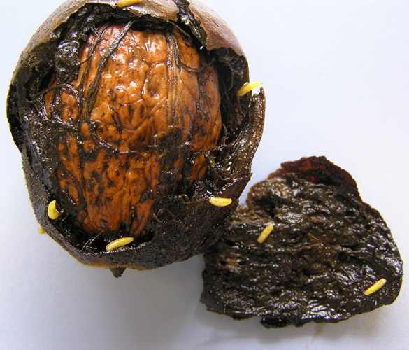Zur Erntezeit werden die schwarz verfärbten, faulen Fruchtschalen in den Baumkronen sichtbar. Sie sind ein Hinweis auf einen Befall der Fruchtfliege, das heißt, ihrer Larven. Die Maden ernähren sich vom Fruchtfleisch, das weich, schwarz und schleimig wird und an der Nussschale klebt. Diese wird dadurch schwarz und unansehnlich. Bei starkem Befall bleibt selbst der Nusskern nicht verschont. Es kommt zu Ertrags- und Qualitätseinbußen. In Italien sind 50 bis 90 Prozent der Nüsse befallen. Nach drei bis fünf Wochen Fraßtätigkeit fallen die weißen Maden alleine oder mit den Nüssen auf den Boden, vergraben sich in der Erde und verpuppen sich. Die Fliegen, so groß wie unsere Hausfliegen mit einem gelben Rückenschild, schlüpfen etwa Ende Juni und legen bis September ihre Eier in die grünen Fruchtschalen, aus denen die Larven schlüpfen.
