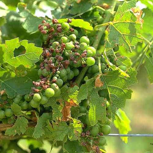 Den Weintrauben droht Gefahr: Anhaltend schwül-warmes Wetter und sintflutartige Regenfälle begünstigen Peronospora (Falscher Mehltau) und den Befall mit Traubenwicklern.2008 ist als Oidiumjahr (Jahr des Echten Mehltaus) in die Geschichte des Weinbaus eingegangen. 2009 könnte ein Peronosporajahr werden. Davon geht das Dienstleistungszentrum Ländlicher Raum (DLR) Rheinhessen-Nahe-Hunsrück schon jetzt aus. Das abwechselnde Auftreten von Oidium und Peronospora sei nicht ungewöhnlich, erklärt Dr. Edgar Müller vom DLR Rheinhessen-Nahe-Hunsrück. Das diesjährige schwül-warme Wetter sei geradezu ideal für den Falschen Mehltau. Die Peronospora wird durch den Pilz Plasmopara viticola hervorgerufen; sie ist eine der gefährlichsten Reberkrankungen. Zwei bis drei Zentimeter große helle, ölige Flecken auf der Blattoberseite und ein schneeweißer Pilzrasen auf der Blattunterseite lassen die Blätter welken und abfallen (Blattfallkrankheit). Ältere Beeren verfärben sich bläulich, später braun, und schrumpfen zu „Lederbeeren“. Mit Fungiziden kann die Krankheit behandelt werden.