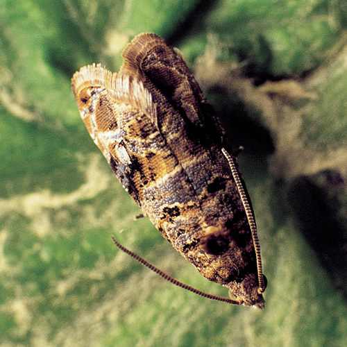 Auch der Traubenwickler tritt in diesem Jahr massiv auf. Der Einbindige Traubenwickler hat strohgelbe Flügel und ein schwarzbraunes Querband. Der Bekreuzte Traubenwickler unterscheidet sich durch gelbgrüne bis gräulich marmorierte Flügel. Zwar scheint derzeit der Einbindige Traubenwickler auf dem Rückzug, dafür setzt der Bekreuzte Traubenwickler seine Flugaktivität munter fort. Die Larven beider Wickler befallen die Blüten und Trauben, die dadurch für den Grauschimmel (Botrytis cinera) anfälliger werden. Der Einbindige Traubenwickler kann mit Pheromonfallen bekämpft werden. Sie verhindern, dass Männchen und Weibchen sich finden. Gegen den Bekreuzten Traubenwickler helfen nur Insektizide.