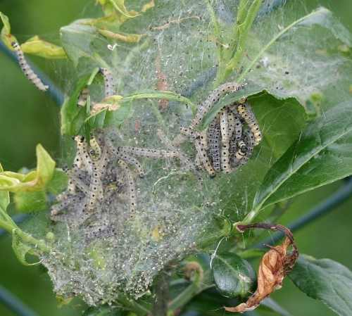 Dichte weiße Gespinste überziehen im Frühjahr insbesondere Obstbäume, Felsen- und Traubenkirsche, Schlehe, Weißdorn oder das Pfaffenhütchen. Gespinstmotten schützen damit ihre Larven.Unter den feinen Netzen laben sich 20 Millimeter lange, gelbgraue bis grüngraue Raupen mit schwarzen Flecken am Rumpf und schwarzem Kopf gut geschützt vor Feinden an den Blättern. Häufig fressen sie Bäume und Sträucher vollständig kahl. „In diesem Jahr ist der Befall regional sehr unterschiedlich“, berichtet Dr. Martin Hommes vom Julius-Kühn-Institut in Braunschweig. Die niedrigeren Temperaturen Anfang Juni haben die Gespinstmotten in ihren Fraßaktivitäten ein wenig gehemmt.