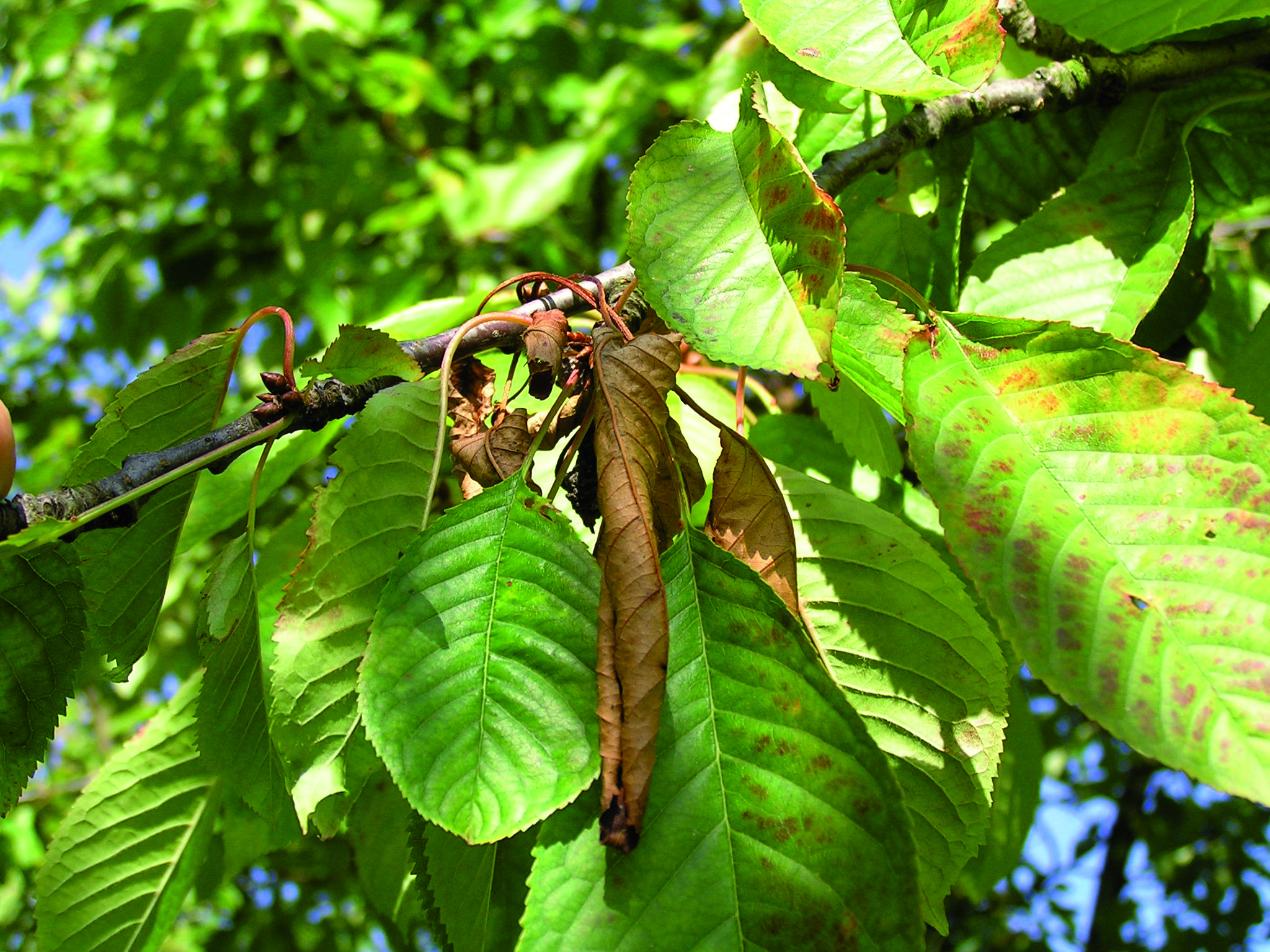 Bei feuchtem und niederschlagsreichem Frühjahrs- und Frühsommerwetter schrillen in den Süßkirschenanbaugebieten die Alarmglocken. Obstgartenbesitzer werden unruhig. Denn dann schlägt mit Gnomonia ein besonders tückischer Blatt- und Fruchtpilz zu, der nur mit konsequentem Pflanzenschutz abzuwehren ist. Dabei spielt das richtige Timing eine entscheidende Rolle.Wenn das typische Schadbild mit eingetrockneten, verbräunten Blättern sichtbar wird, ist der Krankheitszyklus bereits im Gange und das schon seit April des Vorjahres. Zu Beginn zeigen sich undeutliche bleiche Flecke auf den Blättern. Ab Ende Mai verfärben sich die Flecke gelb, in ihrem Zentrum werden rötliche, später braune Stellen sichtbar. Bis zum September fließen diese Flecke zusammen. Bei frühzeitiger Infektion zeigen die Früchte braune Flecke, sie schrumpfen, verkrüppeln und haben Risse. Für die Vermarktung kommen solche Kirschen nicht in Frage. Häufig werden diese Früchte vorzeitig abgeworfen.