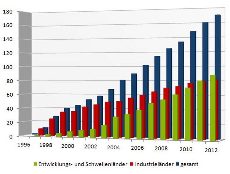 Die wirtschaftliche Bedeutung von gentechnisch veränderten Pflanzen ist nicht weg zu diskutieren. Im vergangenen Jahr (2012) sind weltweit erneut mehr gentechnisch veränderte Pflanzen angebaut worden als 2011. Auf nunmehr 170 Millionen Hektar setzen Landwirte auf Grüne Gentechnik. Der Flächenzuwachs beträgt zehn Millionen Hektar.Vor allem die Entwicklungs- und Schwellenländer versprechen sich viel von gentechnisch veränderten Pflanzen. Hier waren die Zuwächse erstmals höher als in den Industrieländern. Den Nutzen, den man sich durch die Markteinführung neuer Pflanzen wie gv-Zuckerrohr oder neuer gv-Sojabohnen mit einem erhöhten Gehalt an Omega-3-Fettsäuren verspricht, wird hoch eingeschätzt. Auch der Golden Rice mit erhöhtem Vitamin-A-Gehalt soll in Kürze zunächst auf den Philippinen verfügbar sein. Gv-Weizen könnte ab 2020 kommerziell erhältlich sein.