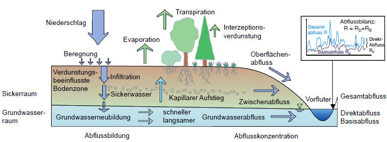 Professor Dr. Hans-Georg Frede, emeritierter Lehrstuhlinhaber für den Landschafts-, Wasser- und Stoffhaushalt an der Justus-Liebig-Universität Gießen, misst der „Interzeption“ ganz entscheidende Bedeutung zu. Das auf den Blättern oder Nadeln zurückgehaltene Wasser fehlt letztlich bei der Grundwasserneubildung. Das erklärt auch die großen Unterschiede zwischen den Oberflächenarten, die bei Vergleichsuntersuchungen gefunden wurden. Im Standardwerk „Landschaftswasserhaushalt, Wasserkreislauf und Gewässer im ländlichen Raum“, von Botho Wohlrab, Verlag Paul Parey, 1992, ist zu lesen „…hat Nadelwald die geringste und Ackerland mit relativ hohem Schwarz- und Halbbracheanteil die höchste potenziell mögliche Grundwasserneubildung“.