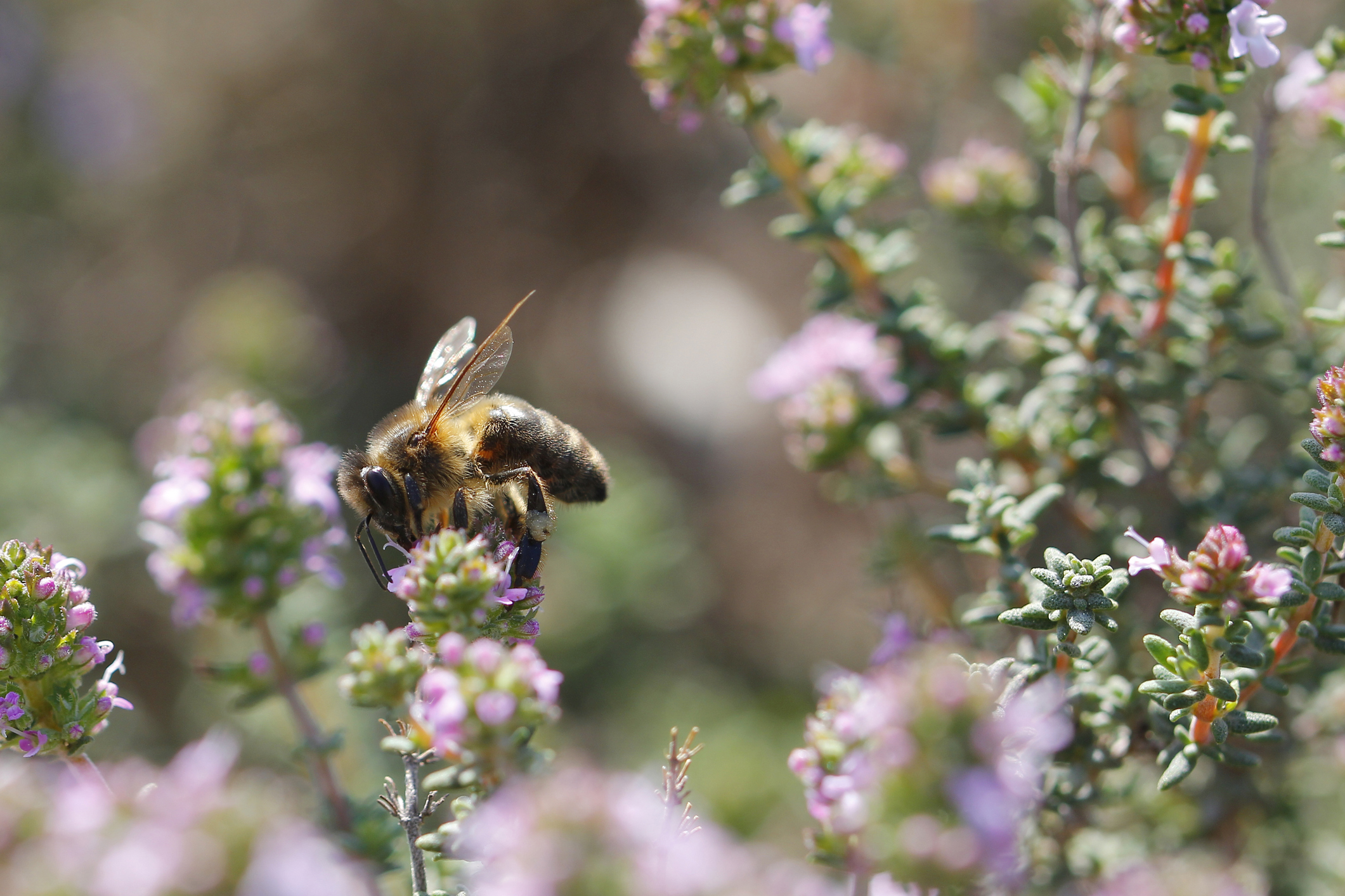Wer den Thymian weder medizinisch verwenden noch essen möchte: Auch Bienen und andere Insekten mögen seinen würzigen Duft. Er ist eine gute Bienenweide im heimischen Garten oder auf dem Balkon. Im Garten pflanzt man Thymian am besten an einem hellen, sonnigen und trockenen Platz, gerne entlang einer wärmenden und windabweisenden Mauer. Er mag nährstoffarme Böden, es sollte also nicht zu viel gedüngt werden. Zusammen mit Salbei kann er Blattläuse und Ameisen aus den Beeten vertreiben. Ausgepflanzt wird Thymian ab Ende April, in etwas raueren Gegenden erst nach den Eisheiligen im Mai. Thymian ist relativ unempfindlich und verträgt Rückschnitt gut. Dieser ist sogar notwendig, denn wenn die Triebe zu lang werden, verholzen sie im unteren Teil und tragen dann dort keine Blätter mehr. Regelmäßig geschnitten, bleibt der Thymian schön buschig und man hat ihn immer frisch zum Würzen in der Küche. Nach der Blüte können die älteren, verholzten Teile heruntergeschnitten werden, er treibt dann aus dem alten Holz wieder aus.