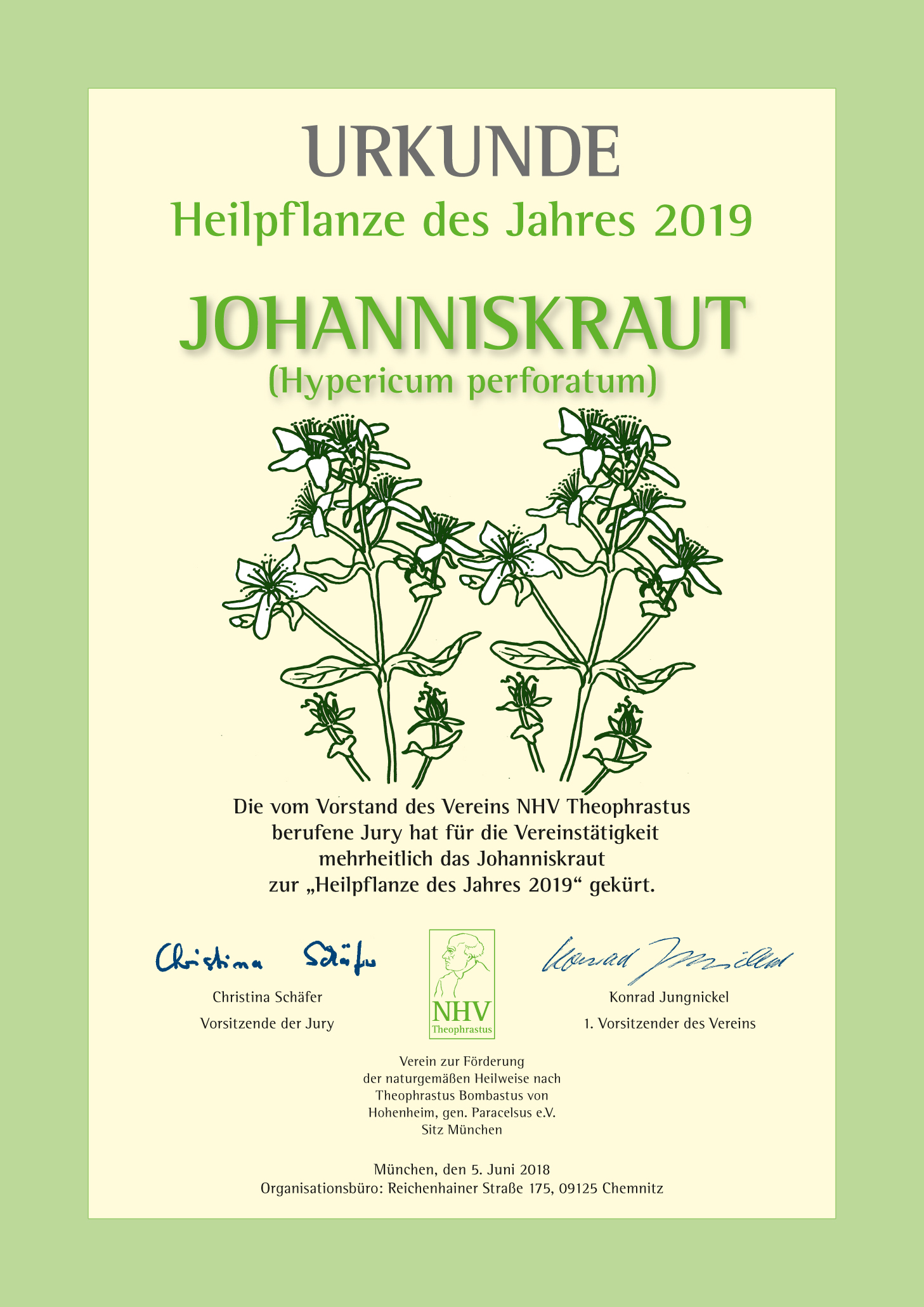 Mit der Kür des Johanniskrauts zur „Heilpflanze des Jahres 2019“ möchte der Naturheilverein NHV Theophrastus das Vertrauen der Menschen in diese altbewährte Heilpflanze stärken. Der Verein, mit vollem Namen „Verein zur Förderung der naturgemäßen Heilweise nach Theophrastus Bombastus von Hohenheim, genannt Paracelsus e. V.“ kürt die „Heilpflanze des Jahres“ seit 2003 und möchte so naturheilkundliches Wissen pflegen und bewahren.Obwohl das Echte Johanniskraut erst 2015 zur „Arzneipflanze des Jahres“ gekürt worden war, fiel die Wahl der Jury zur „Heilpflanze des Jahres“ im Auftrag des NHV Theophrastus auch auf das vielseitige Heilkraut. Heilpraktikerin Christina Schäfer, Jury-Vorsitzende, begründet die Entscheidung so: „Eine Heilpflanze, die so eine Odyssee durchlebt und durchlitten hat, verdient es, wiederholt gewürdigt und unter verschiedenen Aspekten der Naturheilkunde betrachtet zu werden, auch wenn sie bereits Arzneipflanze des Jahres war.“