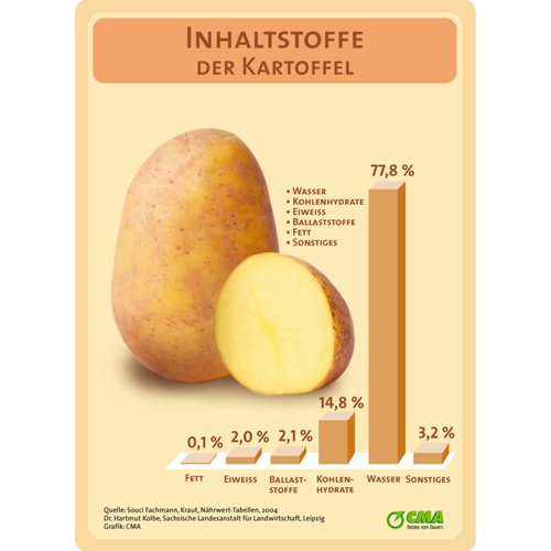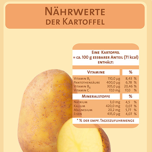 Die Kartoffelpflanze (Solanum tuberosum) gehört wie die Tomate zur Familie der Nachtschattengewächse. Seit der Wende vom 18. zum 19. Jahrhundert, zur Zeit Goethes, mauserte sich die Kartoffel von der Armenspeise zur Nahrung für die bürgerlichen Schichten. Heute schätzt man die gesundheitlich wertvollen Inhaltsstoffe des kalorienarmen „Erdapfels“. Gerade im Winter sind Kartoffeln eine bedeutsame Vitamin-C-Quelle. Schon drei mittelgroße Kartoffeln decken die Hälfte des täglichen Bedarfs. Beachtlich ist ihr Gehalt an Magnesium, Kalium und Eisen sowie an Vertretern der Vitamin-B- Gruppe. Alles über die Inhaltsstoffe der Kartoffel hier.