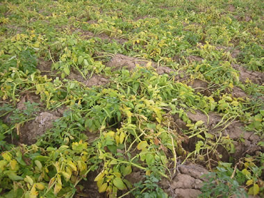 Ist das Frühjahr kalt und trocken, setzen die Kartoffelpflanzen kaum Knollen an. Die wenigen „explodieren“ dann geradezu, wenn ein warmer und ausreichend feuchter Sommer folgt. Schnell würde so die erwünschte Spannbreite der Knollen von 35 bis 65 mm an der jeweils schmalsten Stelle übertroffen. In einer solchen Situation ist eine Krautbehandlung zur Abreife erforderlich. Der richtige Zeitpunkt wird mit Proberodungen festgestellt. Er hängt nicht nur von der Größe, sondern auch vom Stärkegehalt* der Kartoffeln ab. Er ist gekommen, wenn er 80 Prozent des üblichen Gehalts erreicht.
