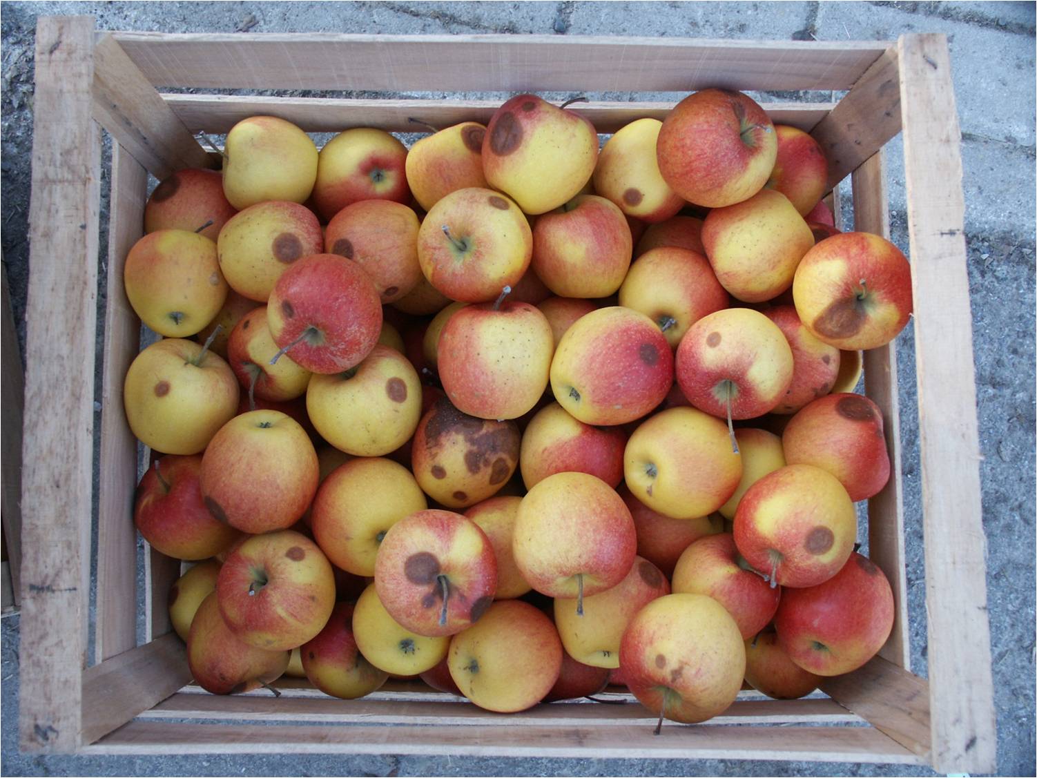 Obstbauern müssen voraus schauend handeln. Selbst wenn die Äpfel bei der Ernte prächtig aussehen, ist das keine Garantie, dass dies so bleibt. Landwirte fürchten die Lagerkrankheiten. Das sind Krankheiten, die bei der Ernte noch nicht sichtbar sind und erst im Lager ausbrechen. Zu den wichtigsten zählen Lagerschorf und Gloeosporium-Fruchtfäule. Daneben treten auch immer wieder Krankheiten auf, die durch Pilze wie Monilia, Botrytis, Penicillium, Alternaria oder Nectria ausgelöst werden. Um den Verderb der Früchte zu verhindern, beugen die Obstbauern schon lange vor der Ernte vor.Bei der Gloeosporium-Fruchtfäule bilden sich die runden, hellbraunen, faulen Stellen erst nach einiger Zeit im Lager. Der Pilz als Krankheitserreger lebt das ganze Jahr über am Baum. Durch Niederschläge ist die Übertragung in jedem Entwicklungsstadium möglich. Der Schorfpilz lebt hingegen am Boden auf den infizierten Blättern des Vorjahrs. Im Herbst kann er dann Infektionen an den Früchten hervorrufen. Dabei entstehen kleine schwarze Flecke, die sich im Lager vergrößern.