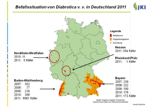 Die Ergebnisse der letztjährigen Monitorings sind unter anderem auf einer interaktiven Karte des neuen Infoportals www.diabrotica.de zu finden. Die Karte zeigt, wie sich der Schädling seit 2007 verbreitet hat. Nach den ersten Funden in Teilen Bayerns und Baden-Württembergs im Jahr 2007 tauchte er 2010 erstmalig in Nordrhein-Westfalen auf. 2011 gab es nur einen kurzen Moment zur Freude: In Nordrhein-Westfalen hatten die Ausrottungsmaßnahmen offensichtlich gegriffen, zumindest ging kein weiterer Käfer in die Fallen. Stattdessen wurden die ersten Funde in Hessen und Rheinland-Pfalz sowie eine massenhafte Vermehrung in Baden-Württemberg verzeichnet. Sobald die ersten Ergebnisse 2012 vorliegen, wird die Karte aktualisiert.