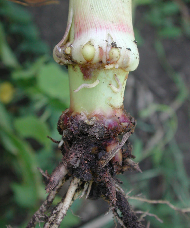Die Larven des Maiswurzelbohrers verursachen den Hauptschaden am Mais. Die ersten beiden Stadien befallen die Feinwurzeln, während das dritte Stadium in die Stängel der Pflanzen eindringt. Diese leiden unter Wasser- und Nährstoffmangel, knicken um und bringen deutlich weniger Ertrag. Zum Teil können sie sich wieder aufrichten. Ihr Wuchs ähnelt dann einem Gänsehals. Folgeschäden entstehen durch Schadpilze, die an den verletzten Stellen eindringen können sowie durch erwachsene Käfer, die sich von Narbenfäden und Pollen ernähren.