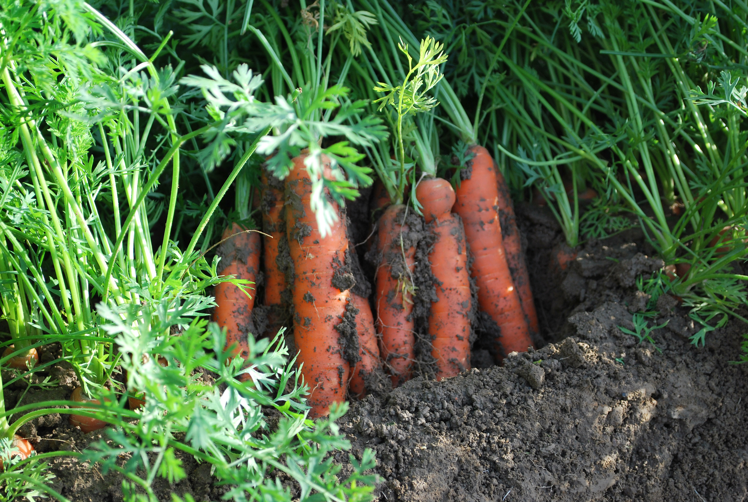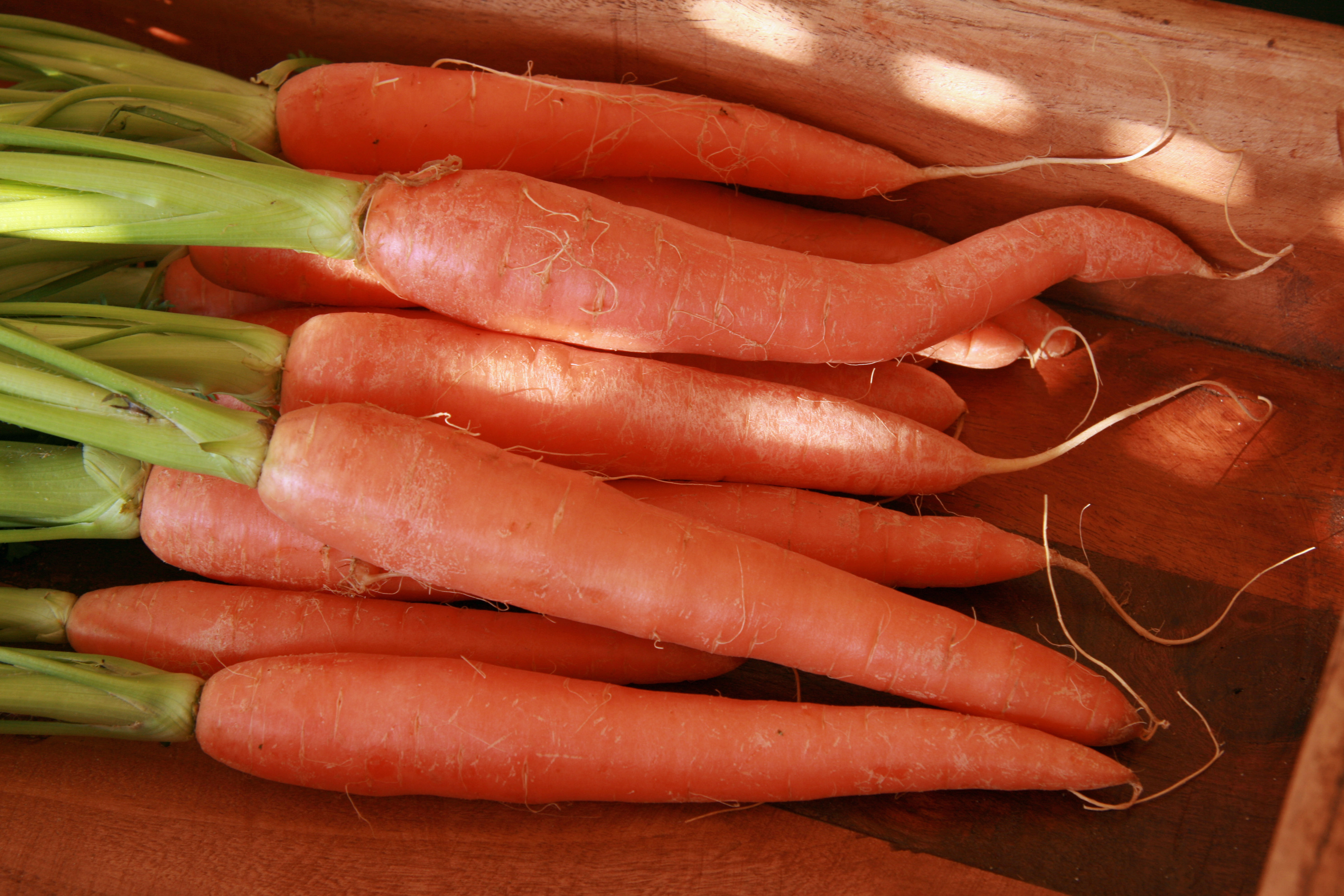 Ab Juni gibt es mittelfrühe Möhrensorten und ab Juli ist sozusagen Hochsaison im Möhrenanbau. Diese zylindrischen großen Möhren sind vier Monate in der Erde gewesen und wiegen daher deutlich mehr als die jungen, eher spitzen Bundmöhren.