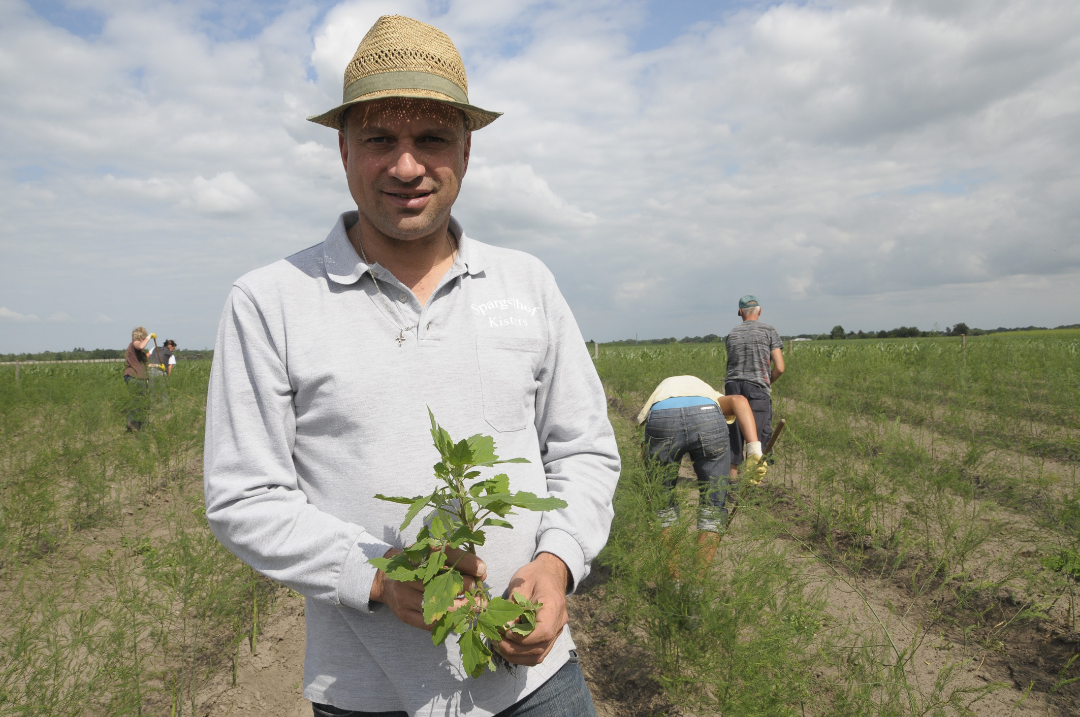 Die offizielle Spargelsaison endet am 24. Juni. Die Ernte war 2014 gut. Erste Arbeit nach der Ernte ist, die Nährstoffe, die dem Boden mit der Ernte entzogen wurden, wieder zuzuführen, sagt Kisters. Anhand von Bodenproben kann der Betriebsleiter feststellen, was den Böden fehlt. Die fehlenden Nährstoffe, vor allem Stickstoff, Phosphor, Kalium und Magnesium, werden genau dosiert ausgebracht: Nach der Düngung werden die Flächen abgedämmt, das heißt, die typischen Erdwälle werden etwas abgeflacht. In den Fahrgassen zwischen den Dämmen wird der Boden bis zu einer Tiefe von 30 bis 40 Zentimetern aufgelockert. Aus den Spargelstangen, die jetzt noch den Boden durchstoßen, entwickelt sich das Spargelkraut. Bevor die Flächen ergrünen, ist die beste Zeit für eine Unkrautbekämpfung. „Wer bis zum Zweiblattstadium nichts gegen Unkräuter unternommen hat, bekommt sie später nicht mehr in den Griff“, sagt Stephan Kisters. Problemunkräuter in den Spargelanlagen sind zum Beispiel der Schwarze Nachtschatten, Windenarten, Knöterich und Hirse. Auch Kartoffeldurchwuchs kommt vor. Später im Jahr und in Junganlagen entfernt der Spargelbauer Problemunkräuter nur noch stellenweise mit der Hacke oder mit der Handspritze.