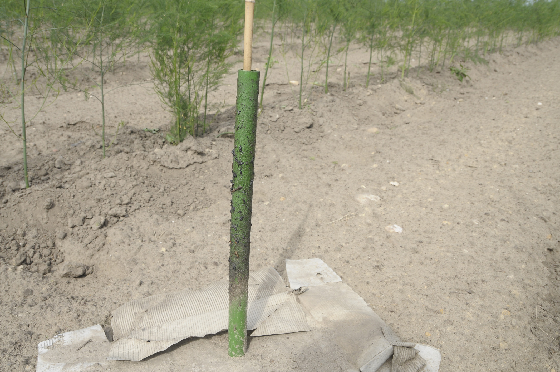 erläutert Kisters weiter. Der Hauptschädling im Spargelanbau ist die Spargelfliege. In befallenen Anlagen verfärbt sich das Laub viel früher als normalerweise und fällt ab. Die Triebspitzen sind oft deformiert und zur Seite geneigt. Ansonsten gibt es kaum äußerliche Kennzeichen. Erst wenn ein Spargelstängel durchgeschnitten wird, zeigen sich senkrecht verlaufende Fraßgänge, in denen sich Larven und brauner Kot befinden. Im Folgejahr geht der Ertrag zurück. Ein weiterer bedeutender Schädling ist das Spargelhähnchen, ein Käfer, der an den Trieben frisst. Dadurch knicken sie um und sterben ab. Die Larven des Spargelhähnchens fressen an den Blättern. Kisters bekämpft die Schädlinge nach dem Schadschwellenprinzip. Stableimfallen, die er in regelmäßigen Abständen in den Anlagen aufstellt, verraten ihm, ob und wann er aktiv werden muss. Anhand der gefangenen Insekten kann er feststellen, welche Schädlinge in welcher Dichte im Bestand sind. Erst wenn die drohenden Ertragseinbußen die Behandlungskosten überschreiten, setzt Kistner gezielt Insektizide ein.