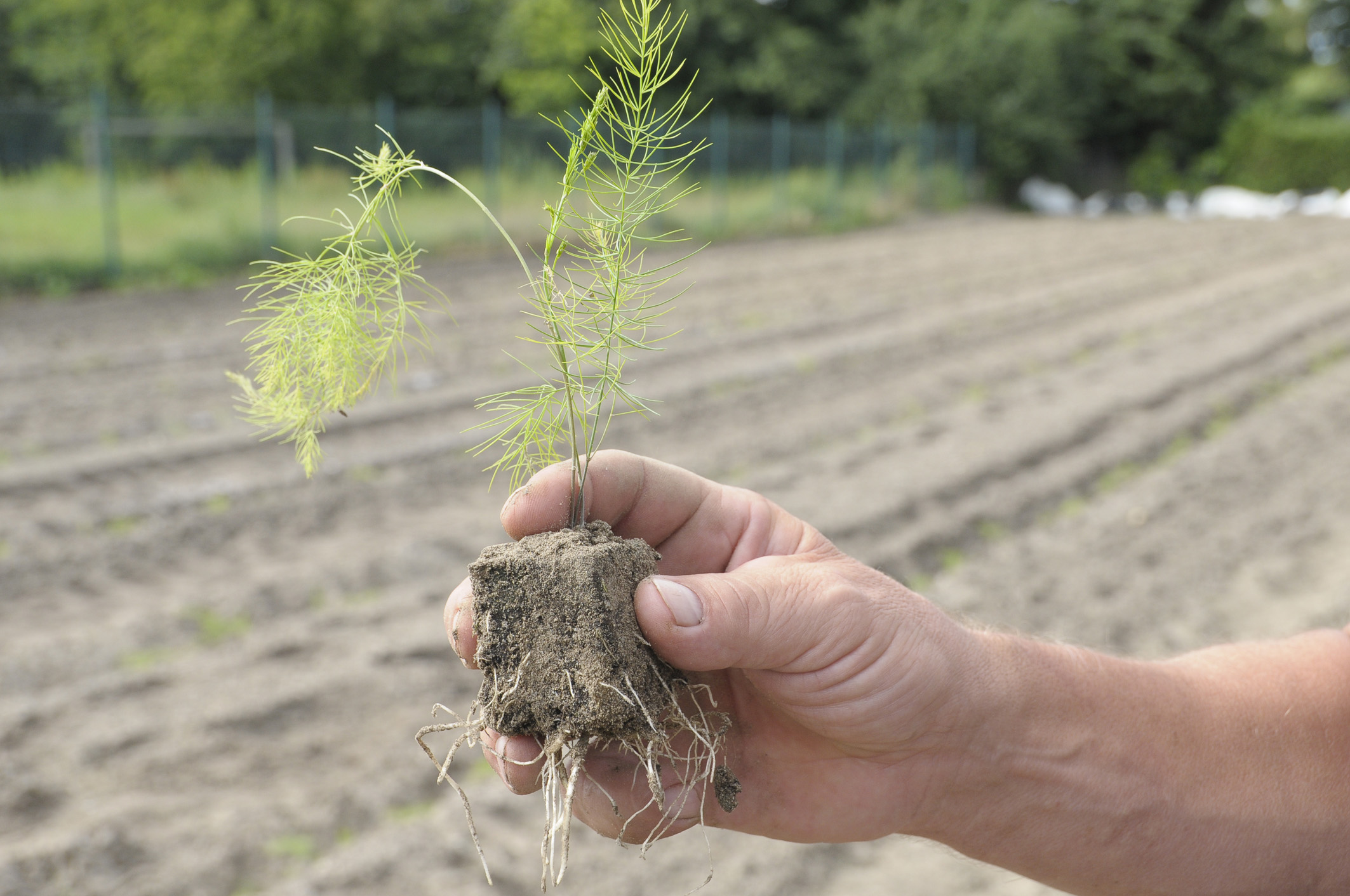 Nach der Blüte Ende Juni, und zwar genau dann, wenn die kleinen, weißen bis blass gelben Blüten abfallen, droht Gefahr von anderer Seite. Pilze dringen über die Ansatzstellen der Blütentriebe, die sogenannten Wundstellen, an den Pflanzen ein. Die mit Schimmelpilzen wie Botrytis und Stemphylium befallenen Triebe verfärben sich gelblich-braun und sterben ab. Unter feuchten Bedingungen ist auch ein grauer Pilzrasen erkennbar. „Gegen Pilzbefall müssen wir in der Regel dreimal behandeln, um die Anlagen gesund zu erhalten“, erklärt Stephan Kisters. Gegen Fusarium bekommen schon die Setzlinge einen Beizschutz mit auf den Weg.