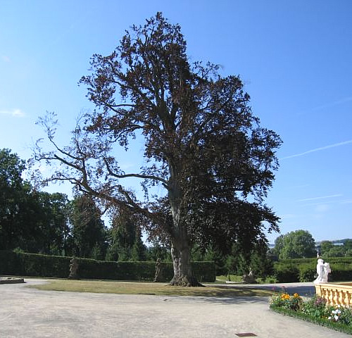 Im Schlossparterre des Hofgartens Veitshöchheim musste ein markanter, 18 Meter hoher Baum mit einem Stammumfang von 386 Zentimetern gefällt werden. Im Boden wurden gefährliche Phytophthora-Pilze nachgewiesen, die zu einem deutlichen Verlust an Fein- und Schwachwurzeln und bereits zum Absterben von Langwurzeln geführt haben, heißt es in einer Pressemitteilung der Bayerischen Schlösserverwaltung. Schon seit zwölf Jahren habe man deutliche Absterbe-Erscheinungen im Kronenbereich beobachtet. In den letzten beiden Jahren habe die Vitalität des Baumes stark nachgelassen.