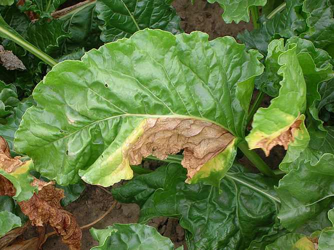 Die Bildung der Assimilate, also von Zucker, findet ja in den Blättern statt. Wenn große Blätter schon im August absterben und kein gesundes Grün nachwächst, kann die Rübe auch nur deutlich weniger Zucker einlagern. Befällt der Verticillium-Pilz Rübenpflanzen, verwelken typischerweise zunächst die Interkostalfelder, das ist das Blattgewebe zwischen den Blattrippen. Oft ist nur eine Seite des Blattes betroffen. Im weiteren Krankheitsverlauf stirbt dann die befallene Blattfläche ab. In der Pfahlwurzelspitze sind Verfärbungen zu finden. Kranke Pflanzen können sich gegen weitere Schaderreger wie zum Beispiel die Fusariumpilze oder auch Rhizoctonia solani schlechter zur Wehr setzen, so dass die Rüben absterben.