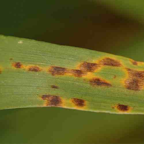 Es erscheinen stecknadelgroße dunkle Punkte, höchstens 5 mm groß, auf den Blättern. Die absterbenden Pflanzenteile, die so genannten Nekrosen, sind auf der sonnenzugewandten Seite sehr dunkel. Sie geben den Blättern das charakteristische gesprenkelte Aussehen. Je nach Stärke des Befalls nimmt die Größe der Nekrosen zu. Bei starkem Infektionsdruck liegen die erkrankten Stellen so dicht beieinander, dass ihre Begrenzungen durch die Blattadern und den gelben Hof nicht mehr zu erkennen sind. Auch die Halme und Grannen werden im fortgeschrittenen Stadium der Erkrankung befallen.