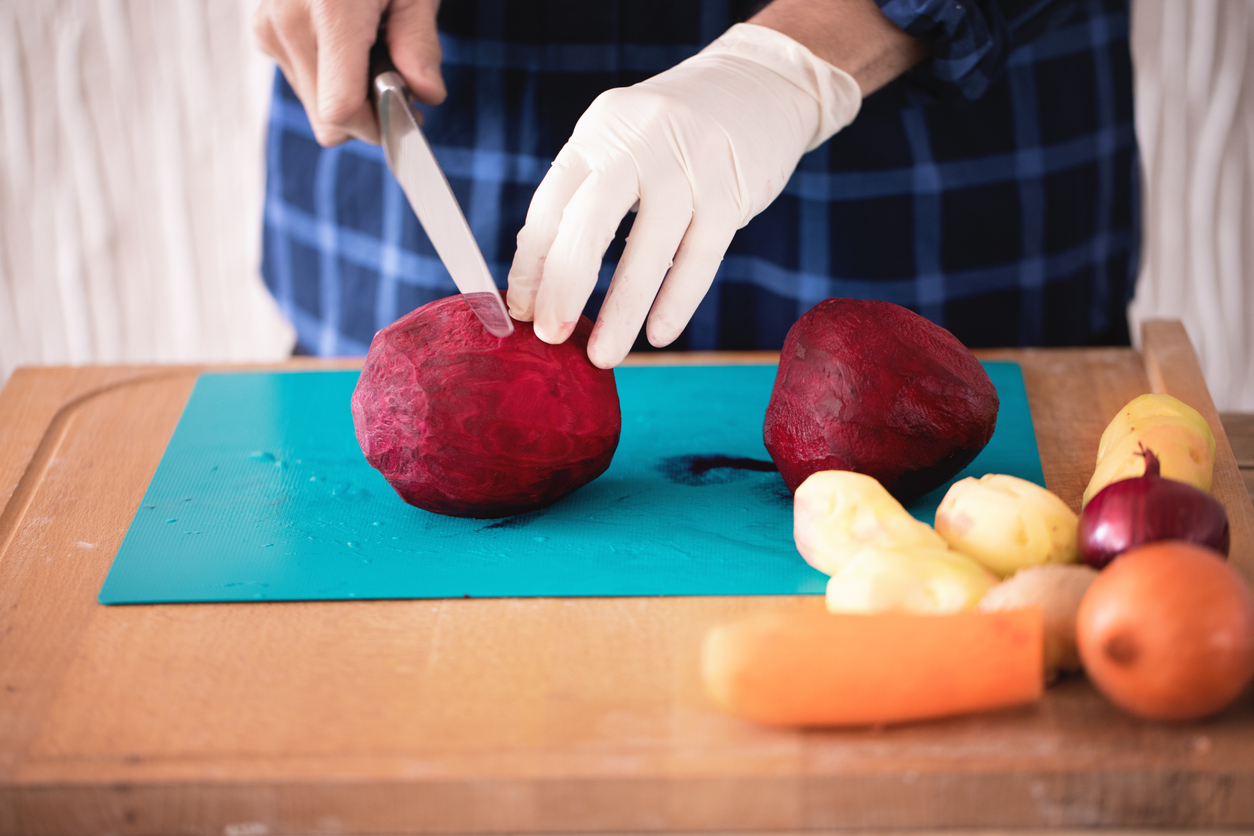 Der Saft der Roten Bete färbt stark. Wer Verfärbungen an Händen oder Schneidebrett vermeiden möchte, trägt daher beim Schälen und Schnippeln am besten Einmalhandschuhe und spült Küchenutensilien direkt im Anschluss ab. Roh wird das geschälte Gemüse vorzugsweise in dünnen Scheiben, fein gewürfelt oder gerieben zubereitet. Zum Garen können die Knollen ungeschält in Salzwasser gegeben werden. Schneller geht es, wenn man sie vorher schält und in Stücke schneidet. Eine weitere Gar-Methode ist das Backen im Ofen, zum Beispiel eingewickelt in Alufolie oder in einem Bräter. So wird das Gemüse besonders aromatisch und die wertvollen Nährstoffe bleiben erhalten. Alternativ können Stifte oder Stücke auch mit Öl vermengt und als Ofengemüse auf dem Backblech zubereitet werden.