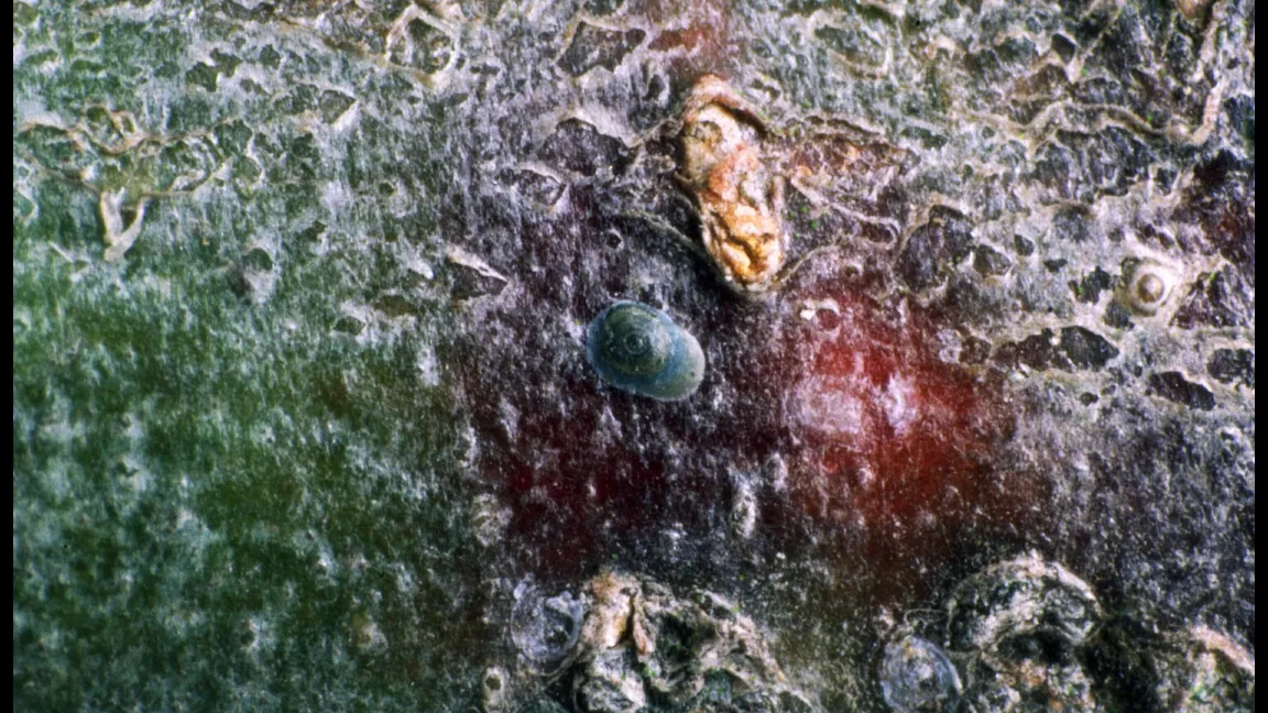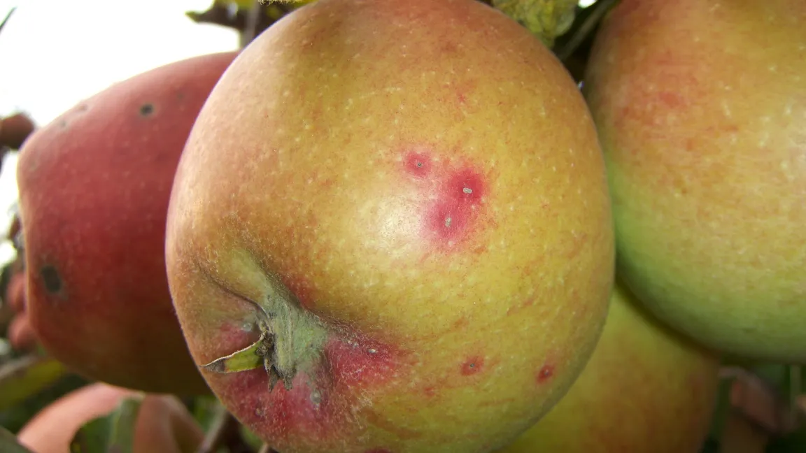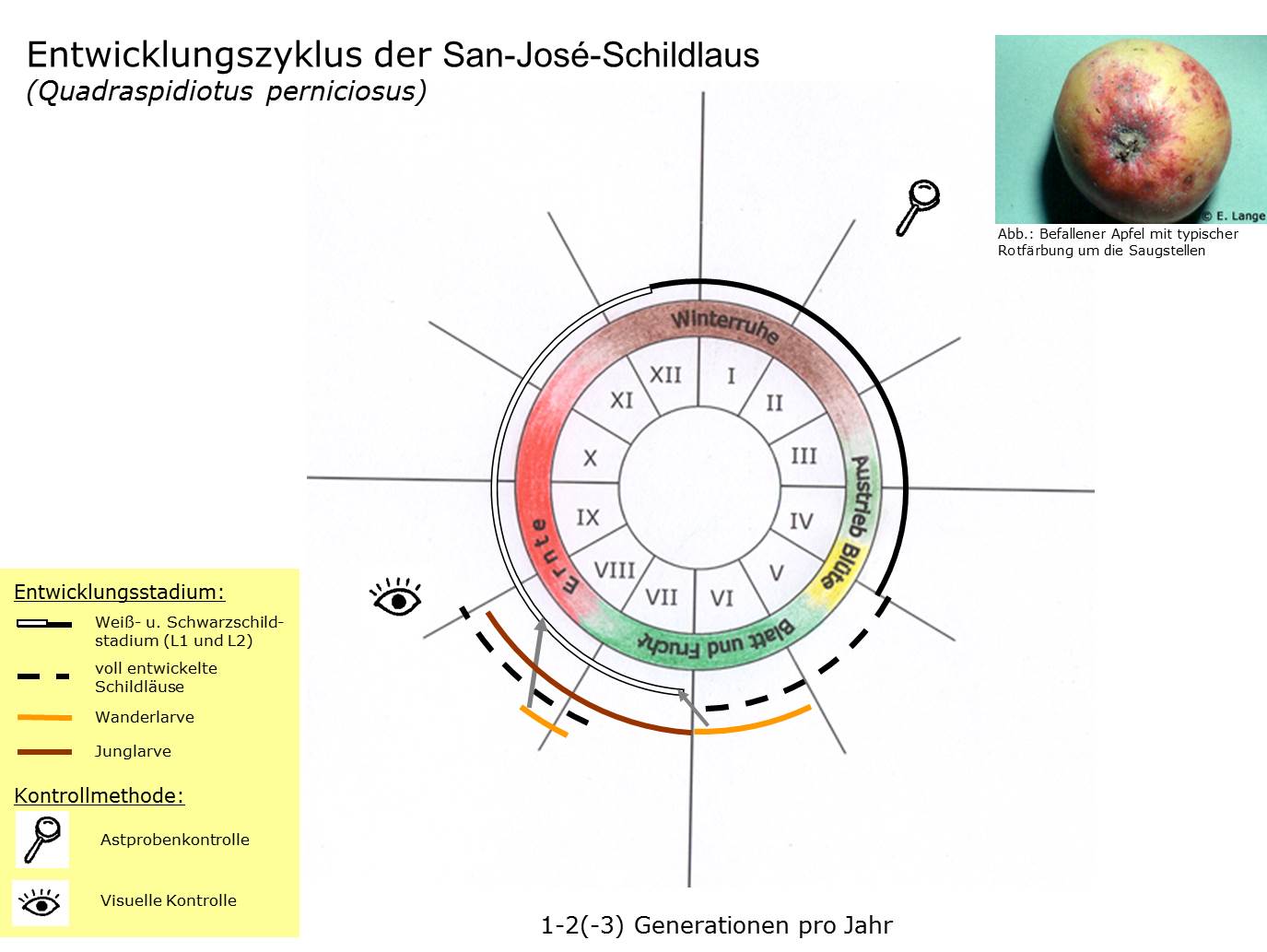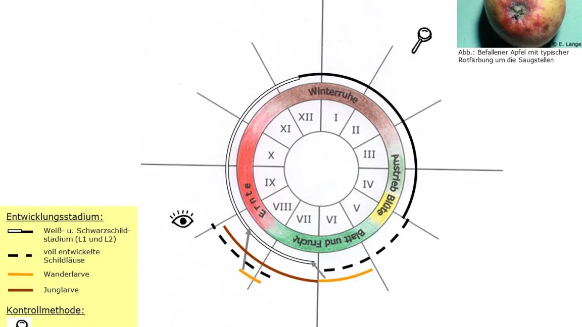 Von Juni bis Oktober sieht man auch helle Pünktchen auf den Pflanzen, das sind die kleinen, gelben, frei beweglichen Wanderlarven. Sie befallen auch Blätter und Früchte und dort mit Vorliebe die Kelch- und Stielgrube. Um die festgesaugte Schildlaus entsteht ein roter Hof, die Früchte sind nicht mehr zu vermarkten.