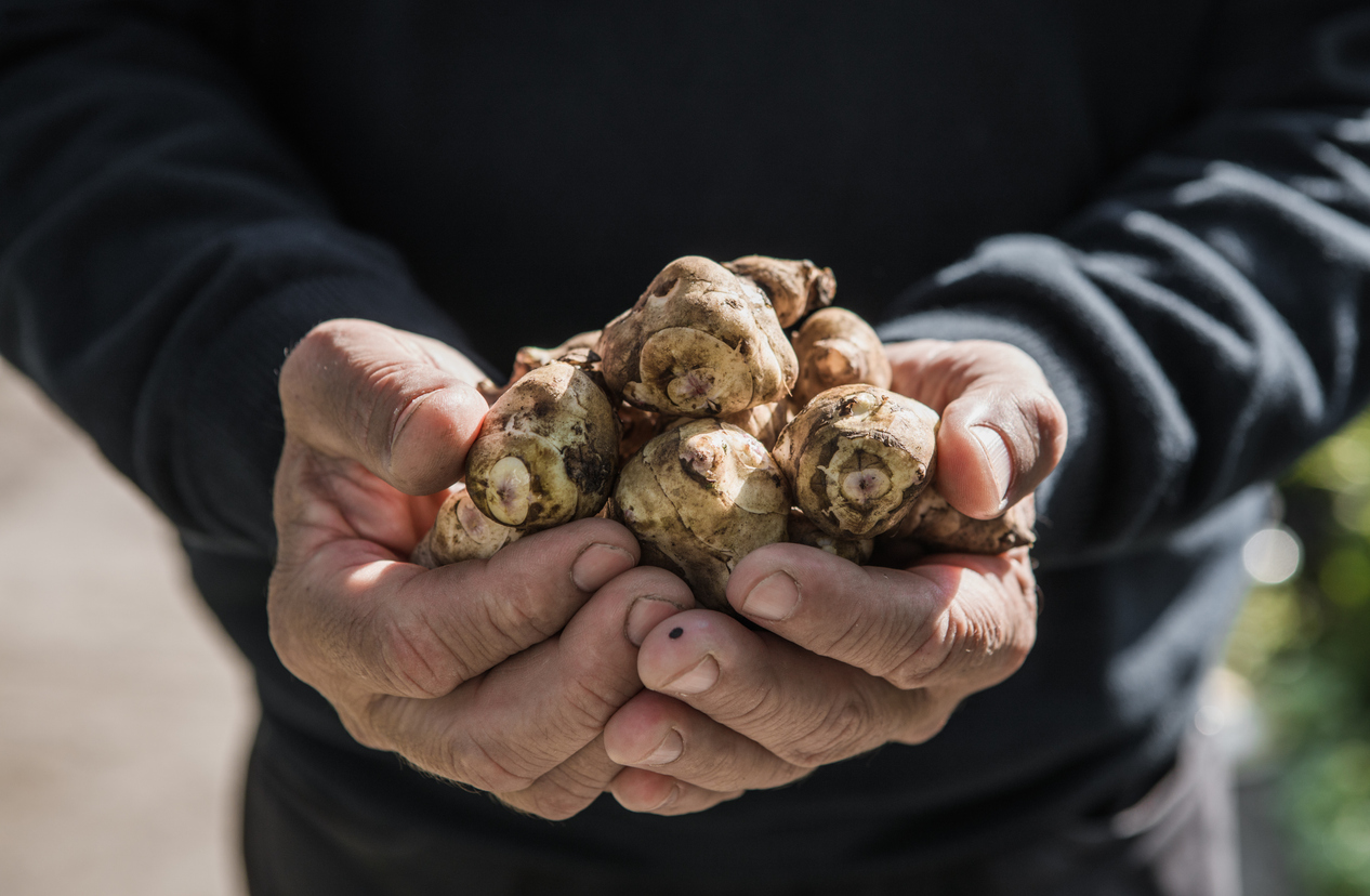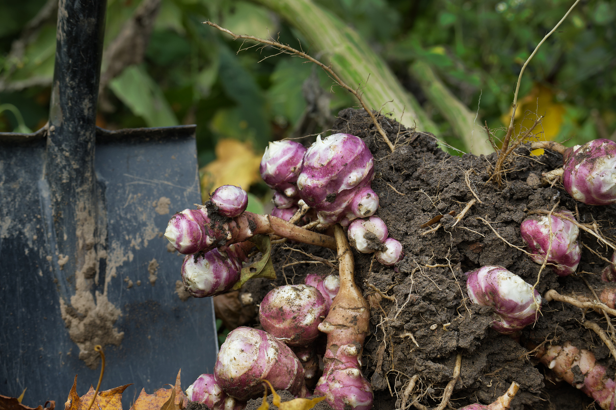 Sobald sich das Kraut braun färbt, können die Knollen ab Oktober bis in den Winter hinein geerntet werden, solange der Boden nicht gefroren ist. Pro Pflanze kann man mit acht bis zehn Tochterknollen rechnen. Im Vergleich zur Kartoffel ist Topinambur allerdings nicht so lange lagerfähig, deswegen empfiehlt sich tatsächlich die Ernte „just in time“. Es gibt auch Gartenbesitzer, die gar nicht an den Knollen für die menschliche Ernährung interessiert sind, sondern den Topinambur einfach nur als leuchtend gelb blühende Bienennährpflanze und als Sichtschutz entlang der Grundstücksgrenze anbauen.
