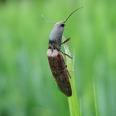 Im Ackerbau richten die Larven des Düsteren Humusschnellkäfers (Agriotes obscurus) und des Saatschnellkäfers (Agriotes lineatus) die größten Schäden an. Die ausgewachsenen, 7,5 bis zwölf Millimeter langen Käfer sind im Mai und Juni besonders aktiv. Sie fressen an den oberirdischen Pflanzenteilen, richten jedoch kaum Schaden an. Der Düstere Humusschnellkäfer ist matt rostbraun bis braunschwarz gefärbt. Der Saatschnellkäfer ist gelbbraun, braun oder dunkel gefärbt, hat helle und dunkle Längsstreifen auf den Flügeln und rosarote Beine und Fühler. Ende Juni, Anfang Juli legen die Weibchen 150 bis 230 Eier in Paketen zu jeweils 20 Stück etwa zwei Zentimeter tief in den Boden. Sie bevorzugen Flächen mit niedrigem Bewuchs wie Wiesen oder nicht bewirtschaftete Flächen. Auch humusreiche Böden und Mulch bieten ausreichend Nahrung und regen zur Eiablage an. Vier bis sechs Wochen später schlüpfen die Larven. Je nach Feuchtigkeit und Nahrungsangebot benötigen die Larven drei bis fünf Jahre für ihre Entwicklung. Sie verpuppen sich im Juli, August in zehn bis 20 Zentimeter Tiefe. Die Käfer schlüpfen bereits im September und überwintern entweder im Puppenlager oder in der Bodenstreu. Die Larven verbringen den Winter gut vor der Kälte geschützt in bis zu 60 Zentimetern Tiefe.