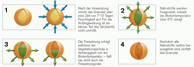 Aus umhüllten Düngern werden die Nährstoffe ebenfalls dosiert abgegeben. Die schwefel- oder polymerhaltige Ummantelung verlängert die Abgabe in den Wurzelraum auf rund sechs Monate. Sowohl bei den stabilisierten als auch den umhüllten Düngern gibt es Mischungen mit nitrathaltigen Düngern. Damit wirkt ein Teil des Düngers bereits ohne jede Verzögerung direkt nach der Ausbringung und kann den akuten Nährstoffbedarf sofort lindern.