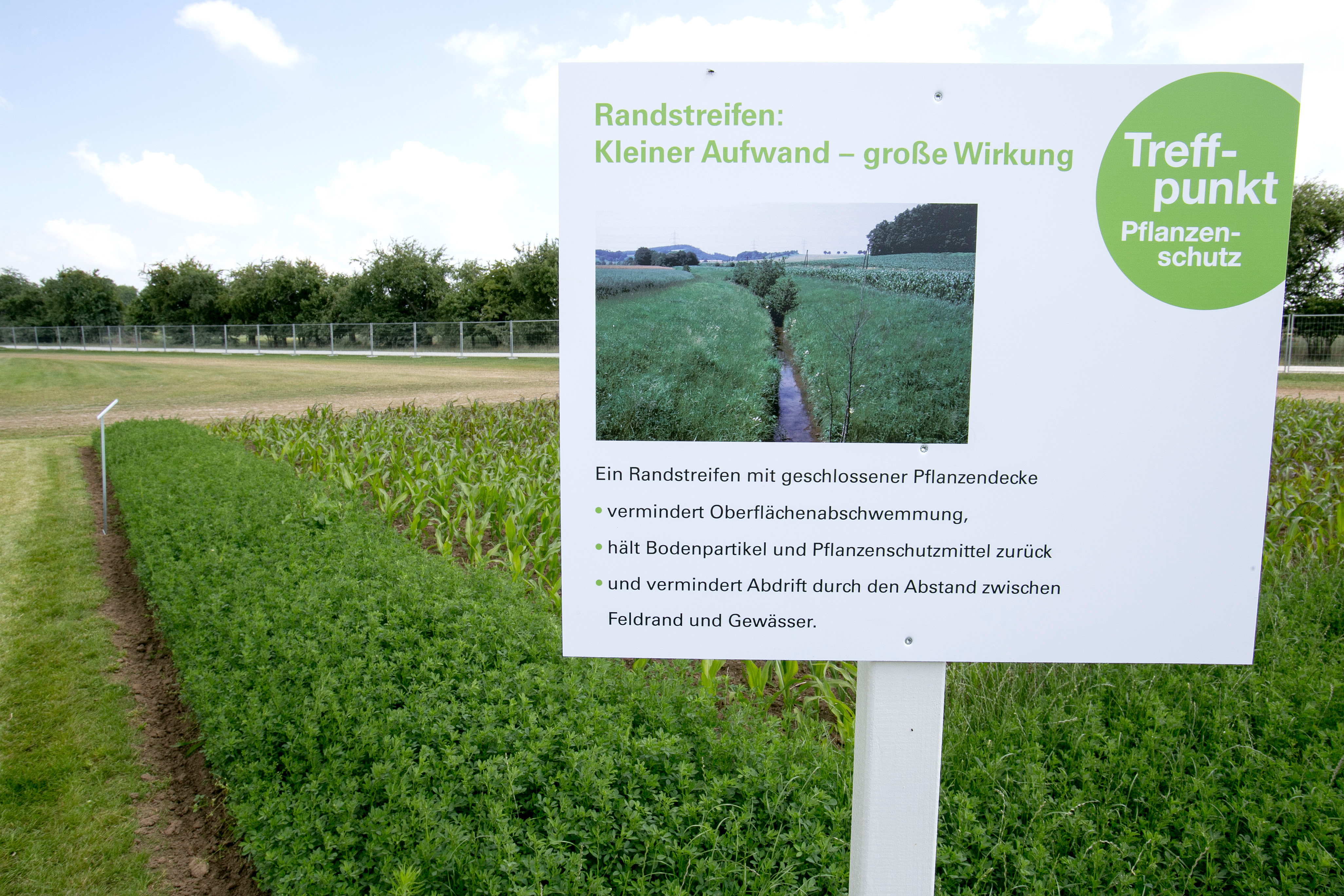 Zum Schutz der Gewässer kann der Landwirt bei der Anwendung von Pflanzenschutzmitteln einen Abstand einhalten, um Drift-Einträge zu vermeiden. Das Anlegen von bewachsenen Randstreifen vermindert den Oberflächenabfluss von Pflanzenschutzmitteln und die Erosion des Bodens.